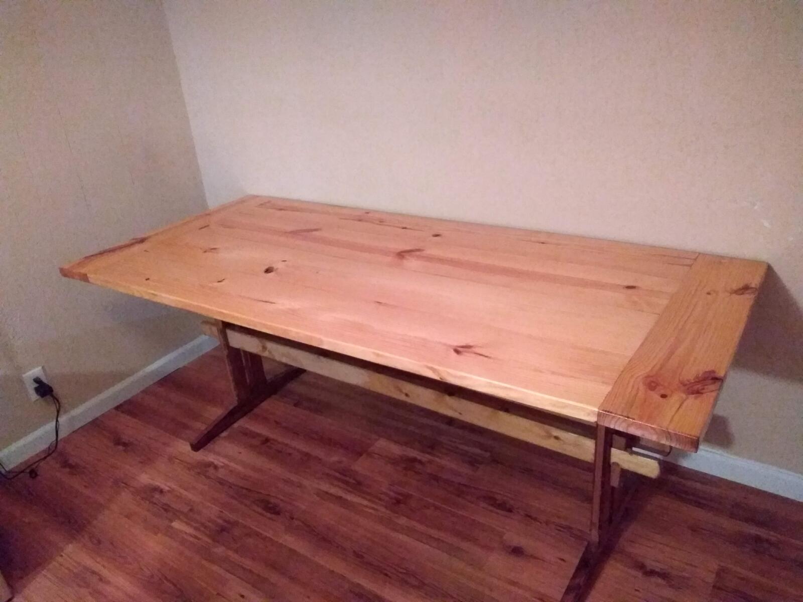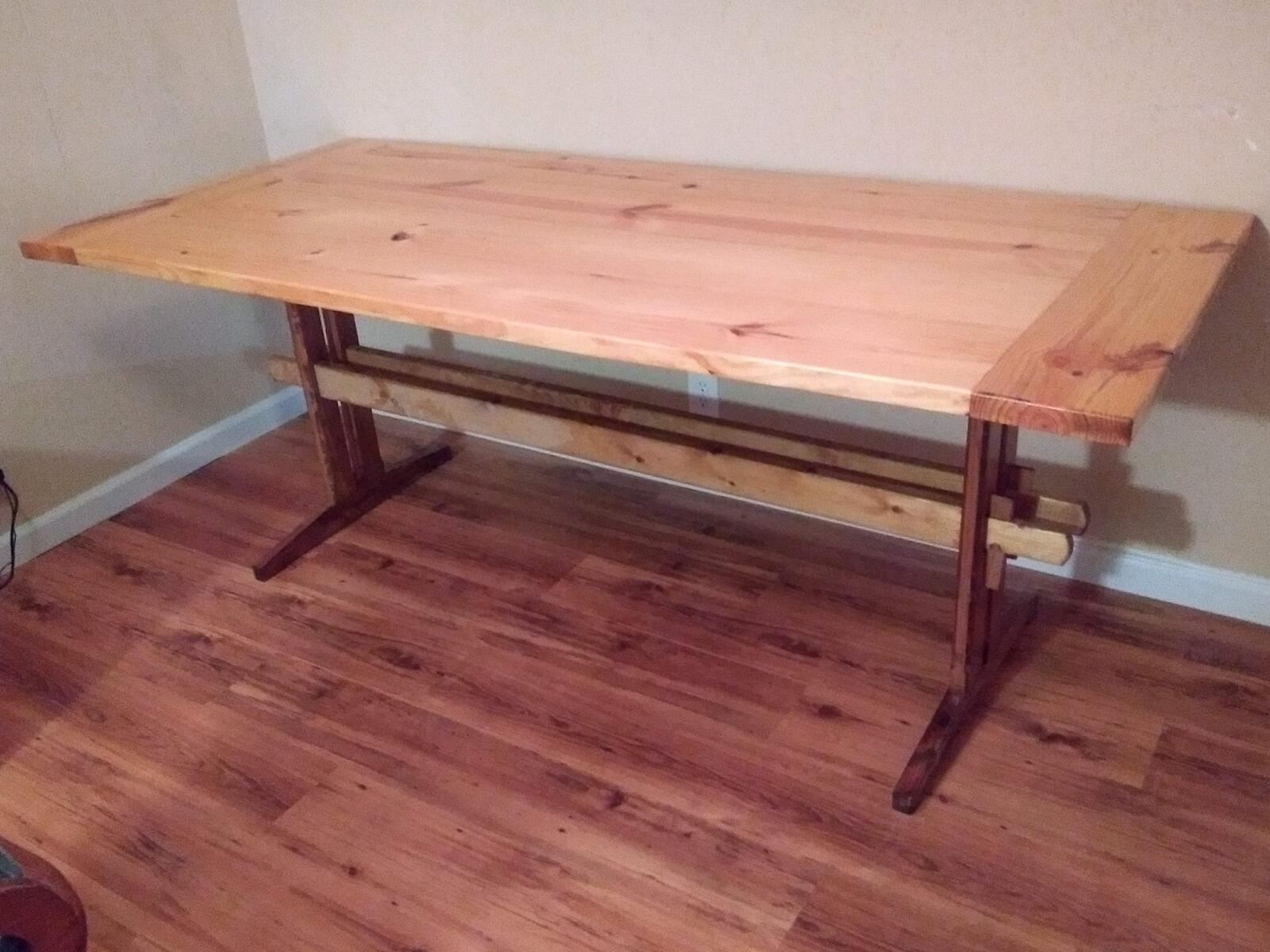 This is one of my early farmhouse table builds. This one is pretty unique with breadboard ends and clear finish. The base is a double trestle with pegs that allows for the quick breakdown of the entire base, and removable pins securing it to the top.