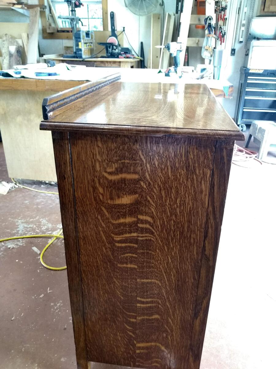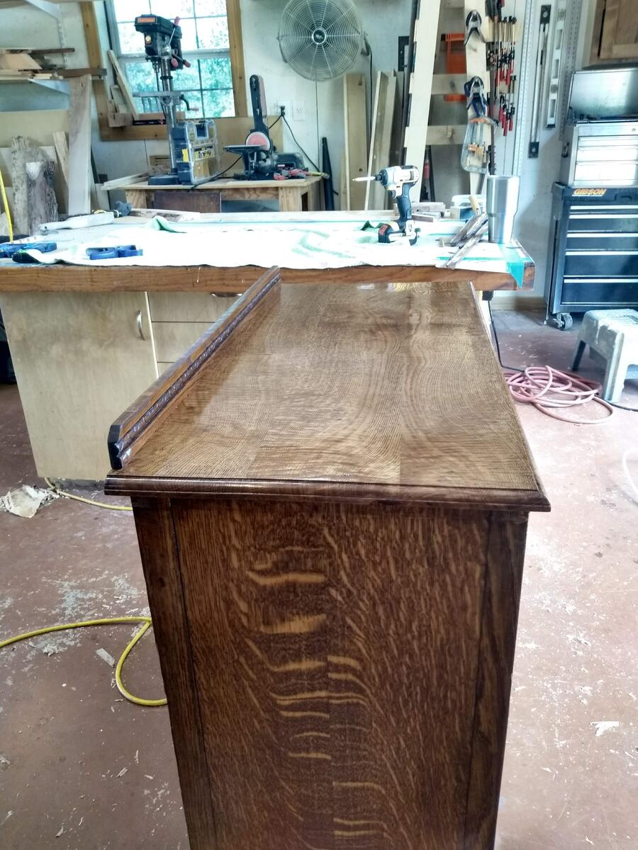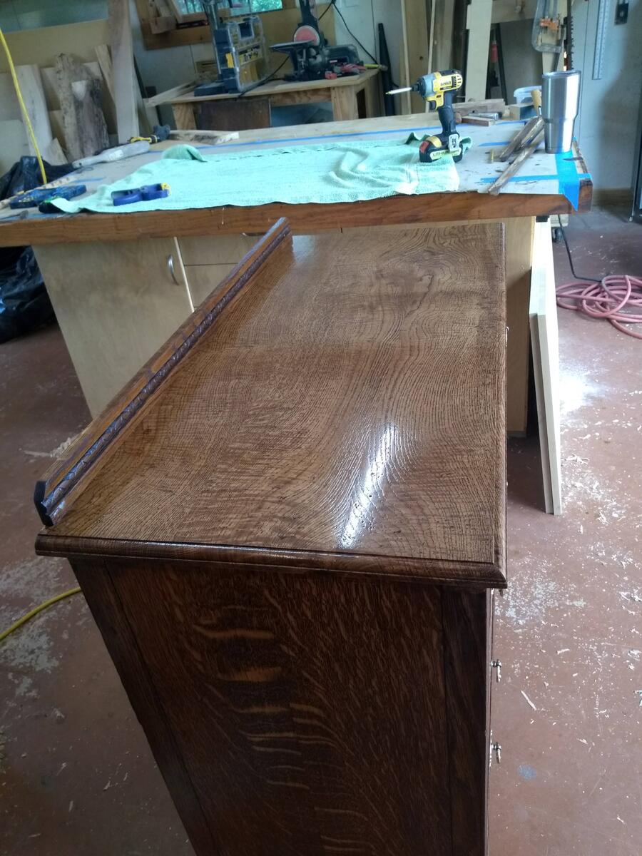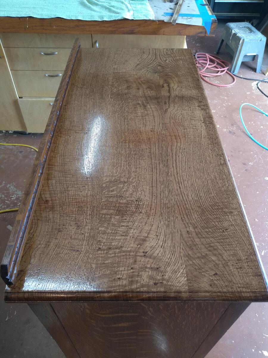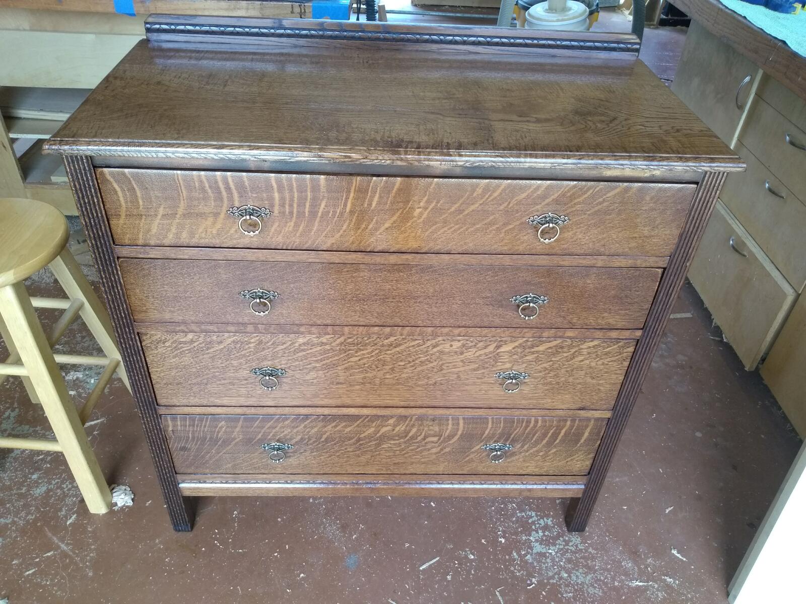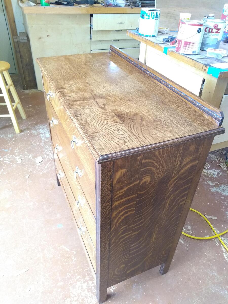 I was asked to restore a dresser for a customer. The dresser was painted and the top had a venear that was pealing off. I found some nice 4/4 oak and built a new top for it. I also stripped all the varnish and paint off it, and found some stunning rays and flecks. Sanded and refinished the wood and put new hardware on.