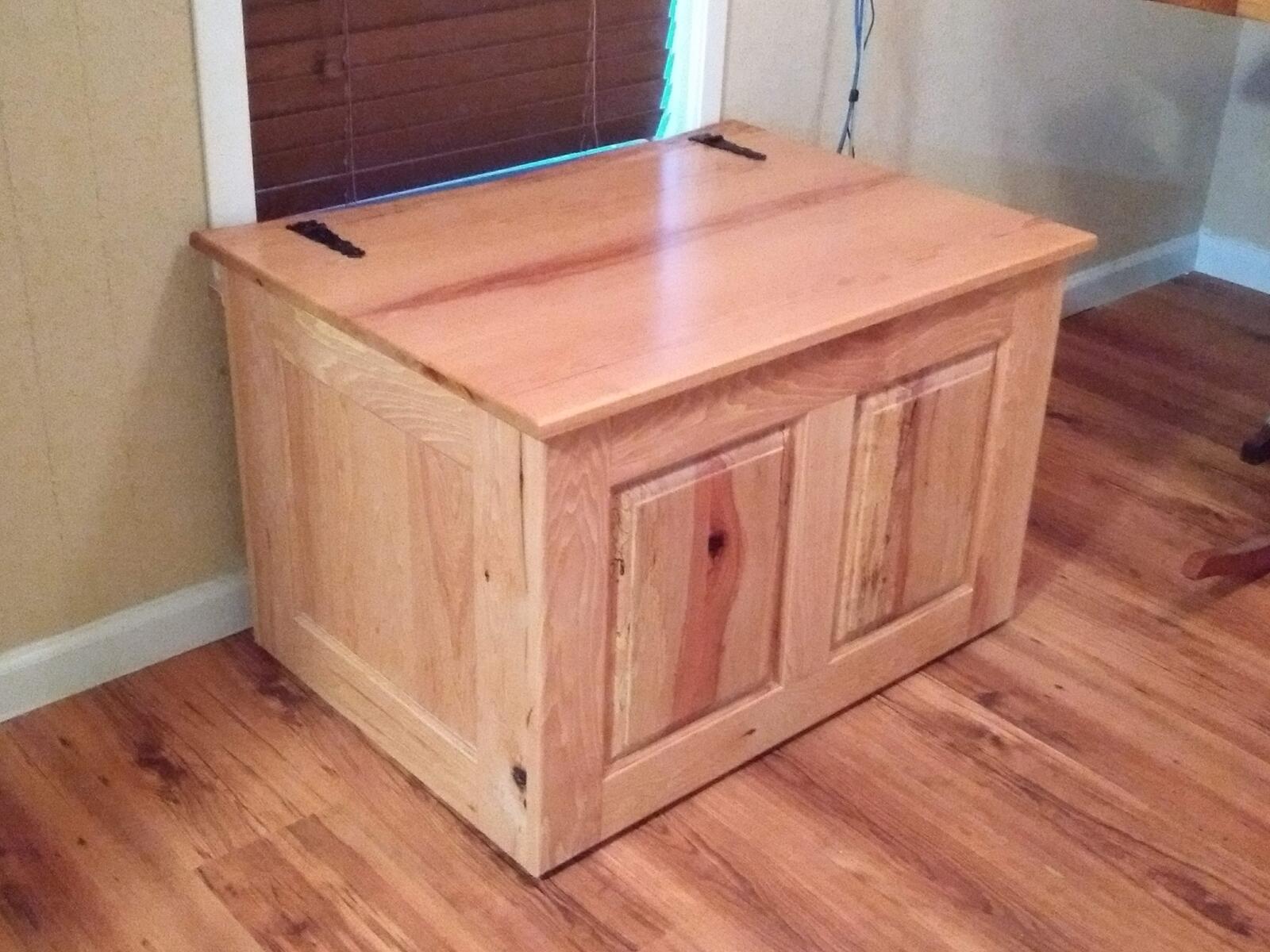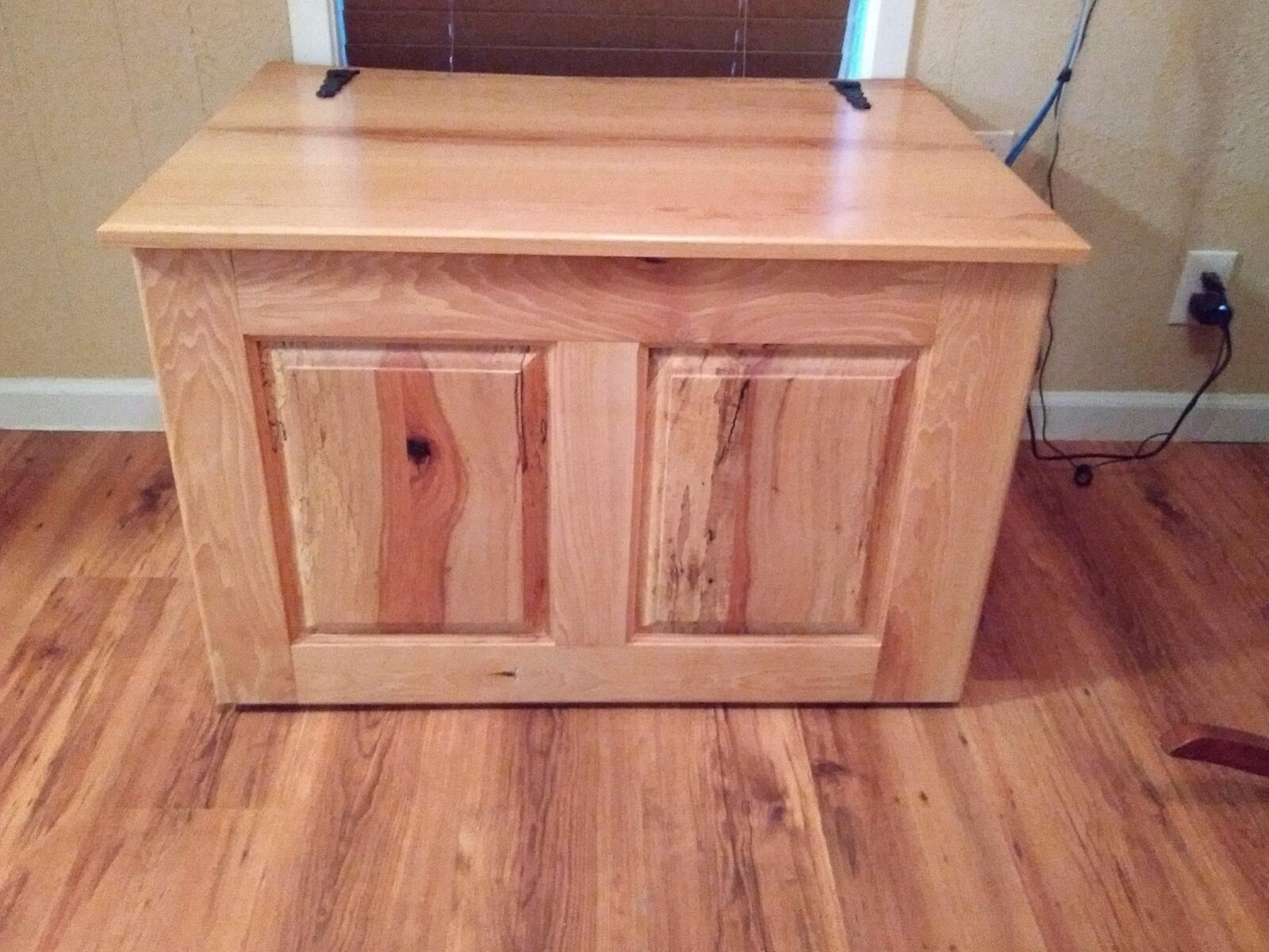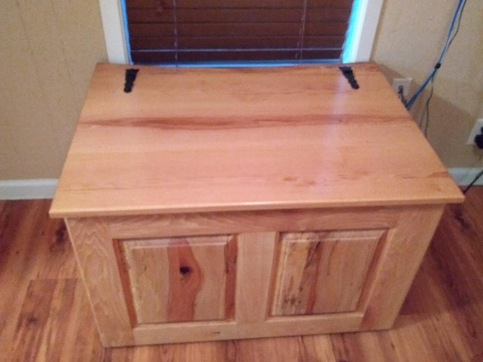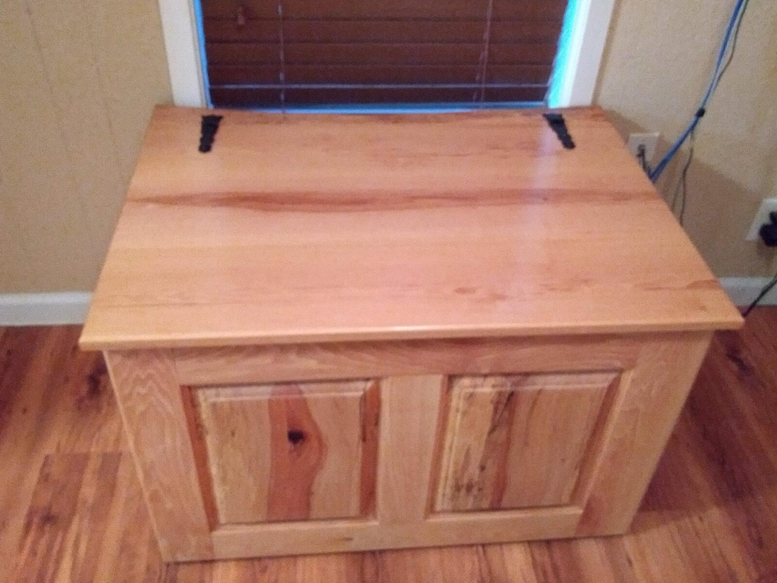 This spalted trunk has a secret. Inside it has 2 separate areas with small passage way through to them. If you look at the outside, you will find a small entry portal. This trunk is actually a litter box and feeding area for our cat. It works perfectly! No smell, and no mess. The cat enters on the far side, eats food and then passes to through the second area in there where his litter box is. The entire box is made from pecan and has raised panels of spalted pecan.