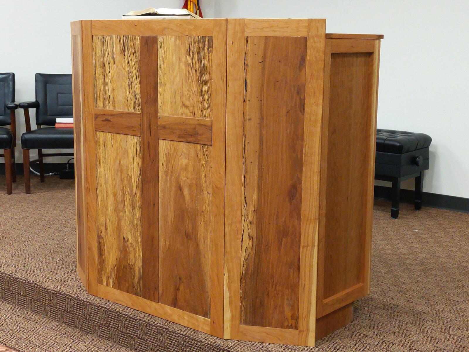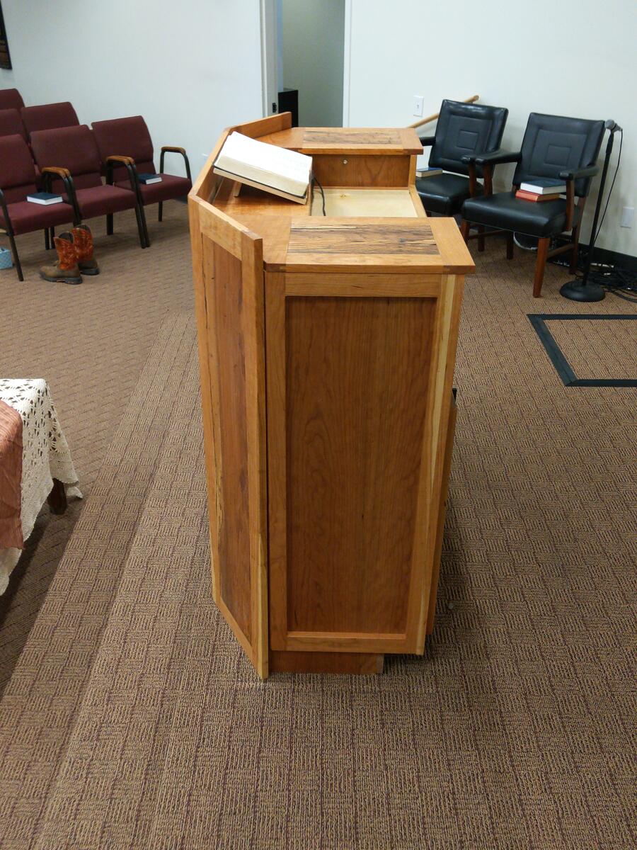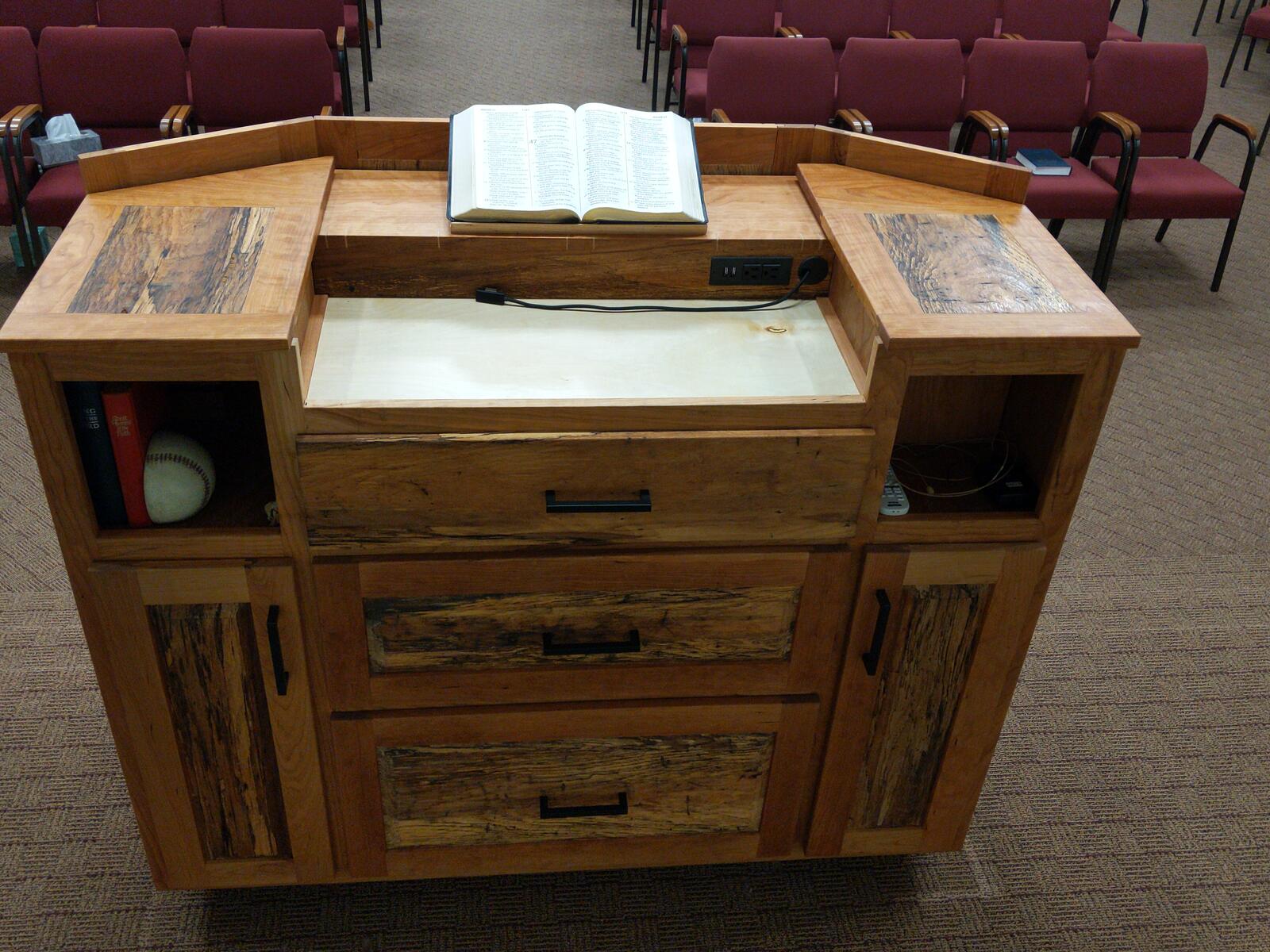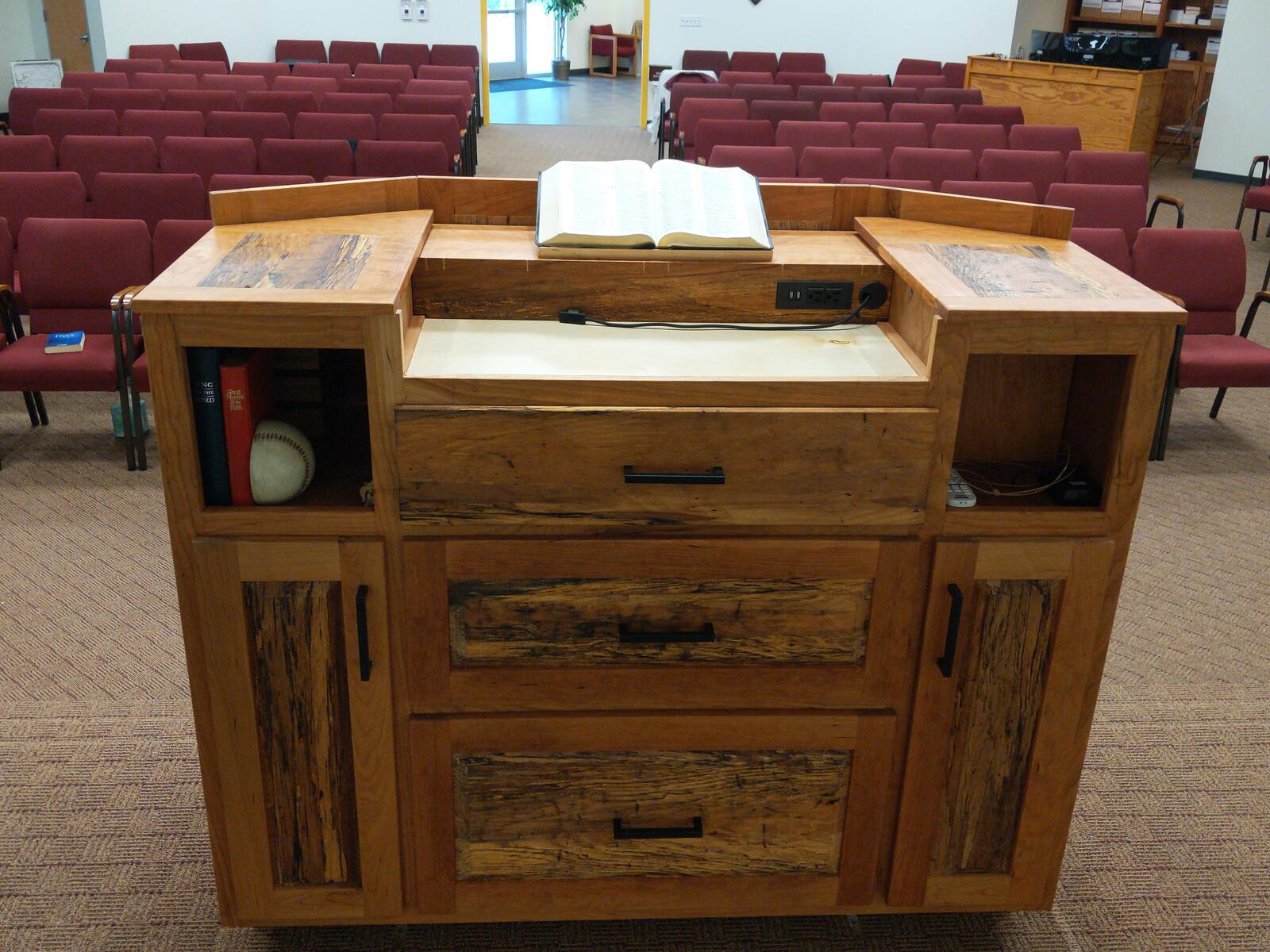 This was a fun build. It has everything built into this. The podium is made from spalted pecan and cherry. Behind the panels is a 1/2" thick balistic hardend steel. It is wired for network as well as power directly in the podium. I built in a hide-a-way area for all the wires and power which is easily accessible. I also have a false wall built in for when you are exersising your 2nd amendment rights. Also has plenty of storage. The cross on the front is proud of the panel by about 1/4 inch, and the spalted wood in the front panel was selected to give the cross to seem to be halo’d by the Light from the Son above. Very fun build.