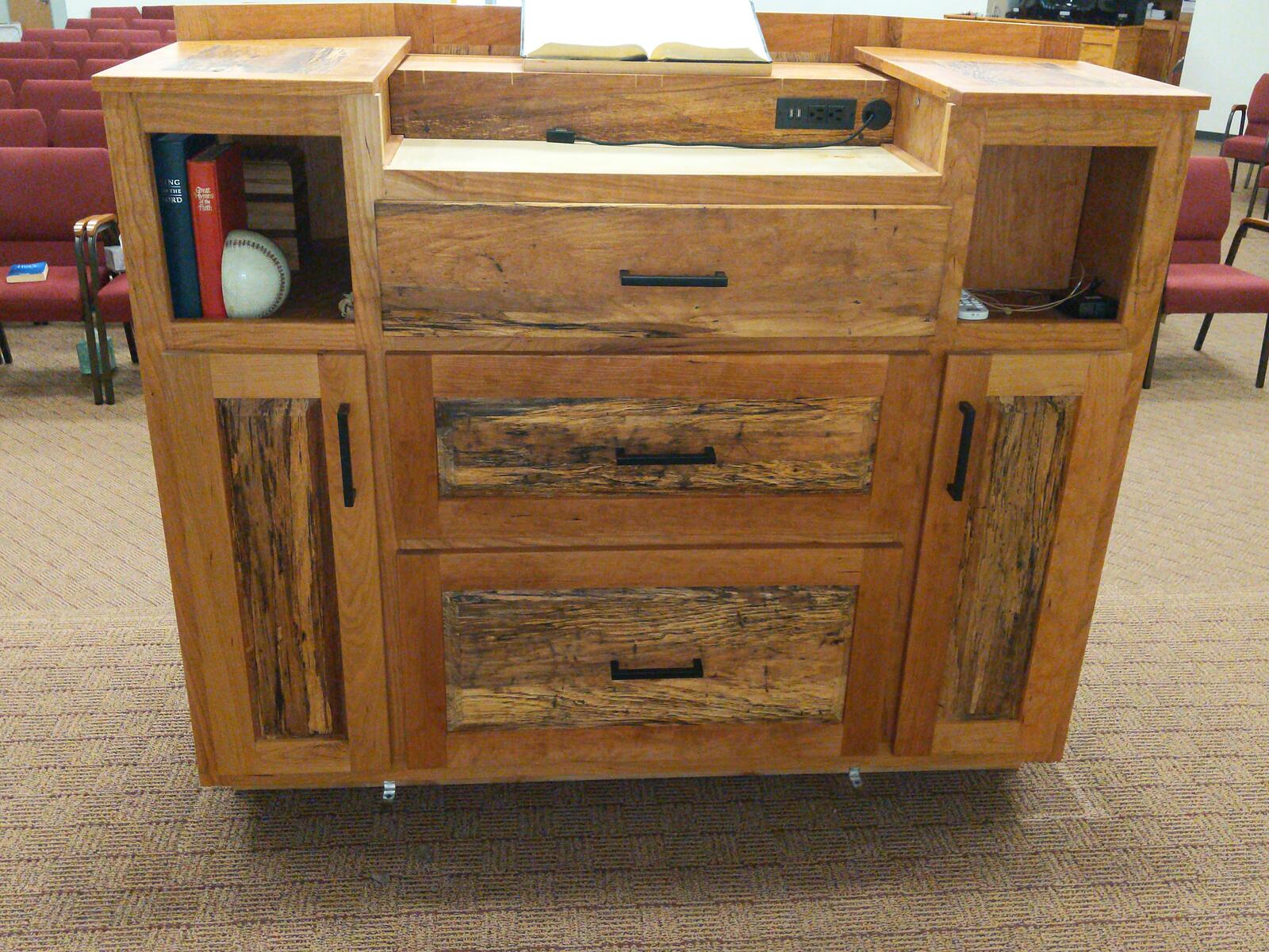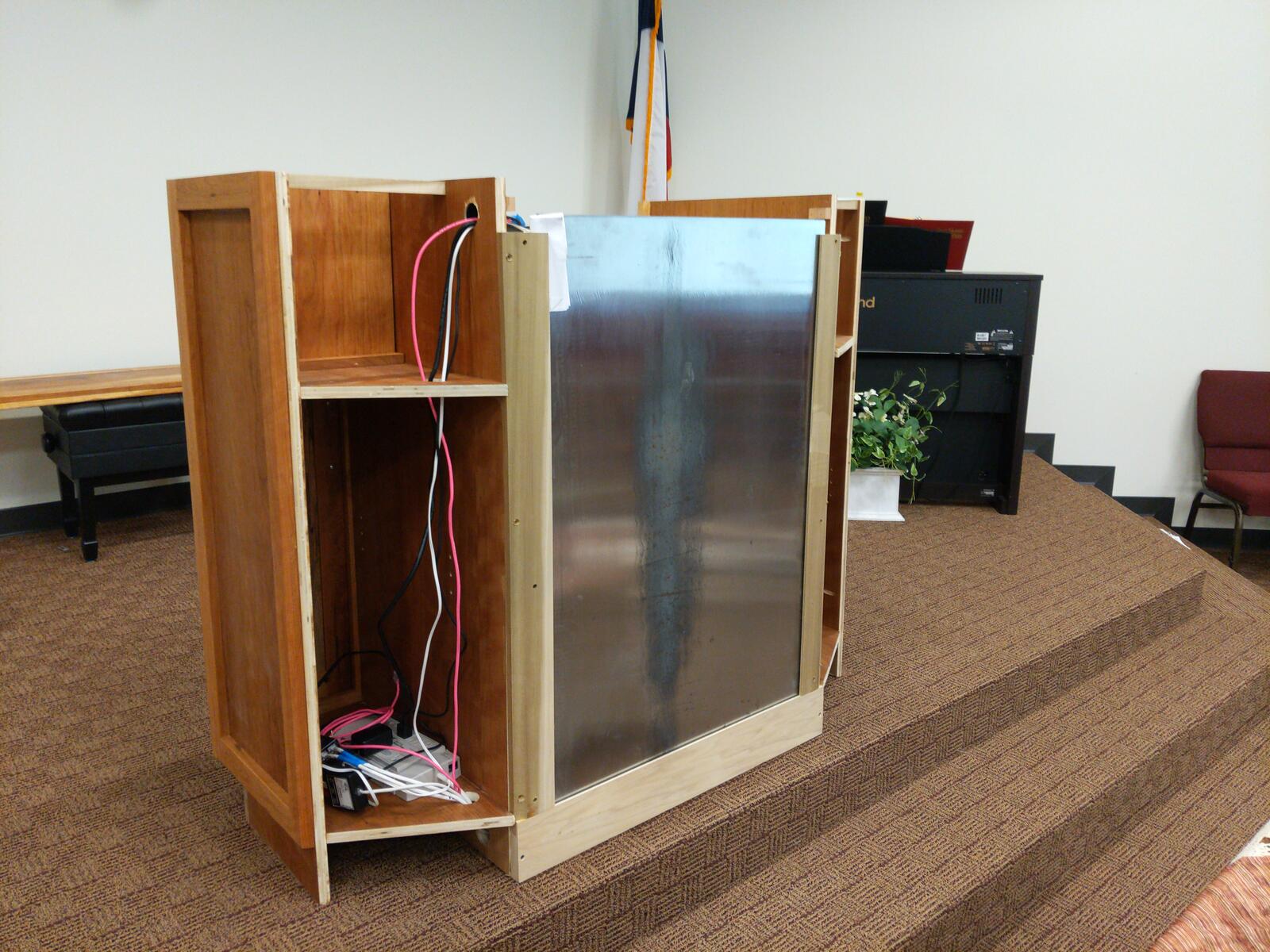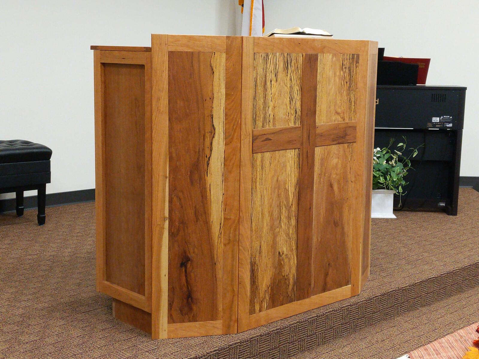 This was a fun build. It has everything built into this. The podium is made from spalted pecan and cherry. Behind the panels is a 1/2" thick balistic hardend steel. It is wired for network as well as power directly in the podium. I built in a hide-a-way area for all the wires and power which is easily accessible. I also have a false wall built in for when you are exersising your 2nd amendment rights. Also has plenty of storage. The cross on the front is proud of the panel by about 1/4 inch, and the spalted wood in the front panel was selected to give the cross to seem to be halo’d by the Light from the Son above. Very fun build.