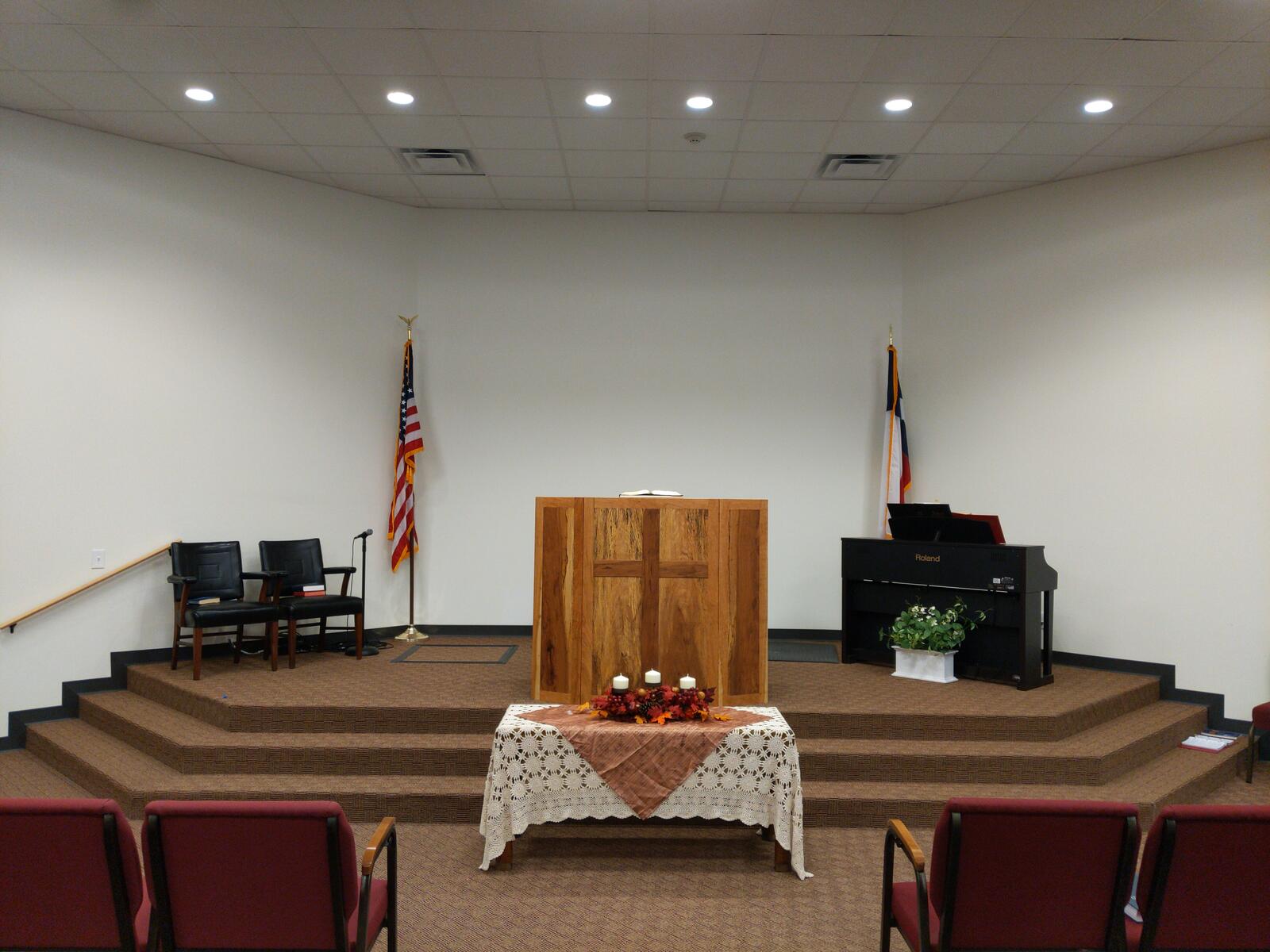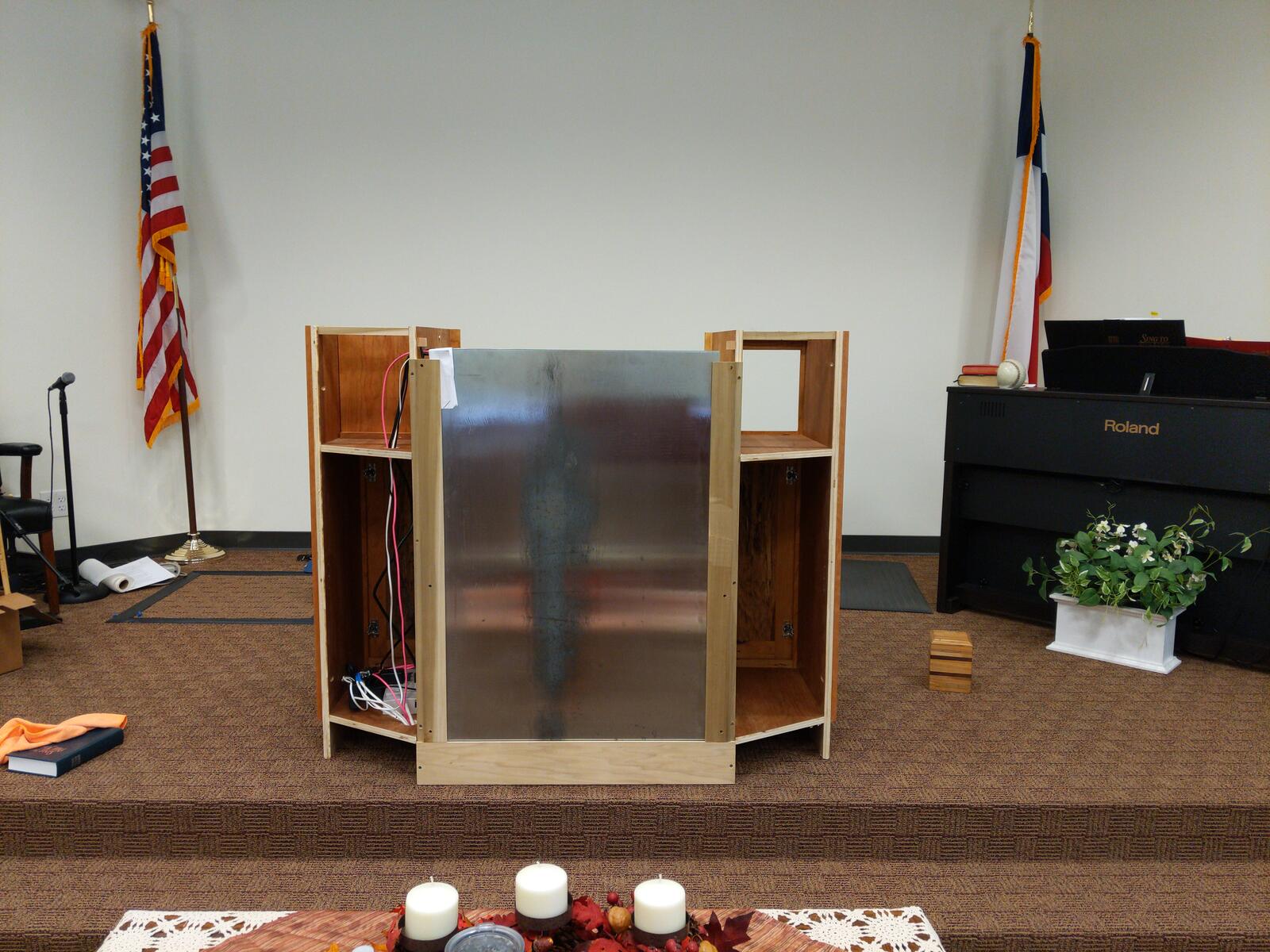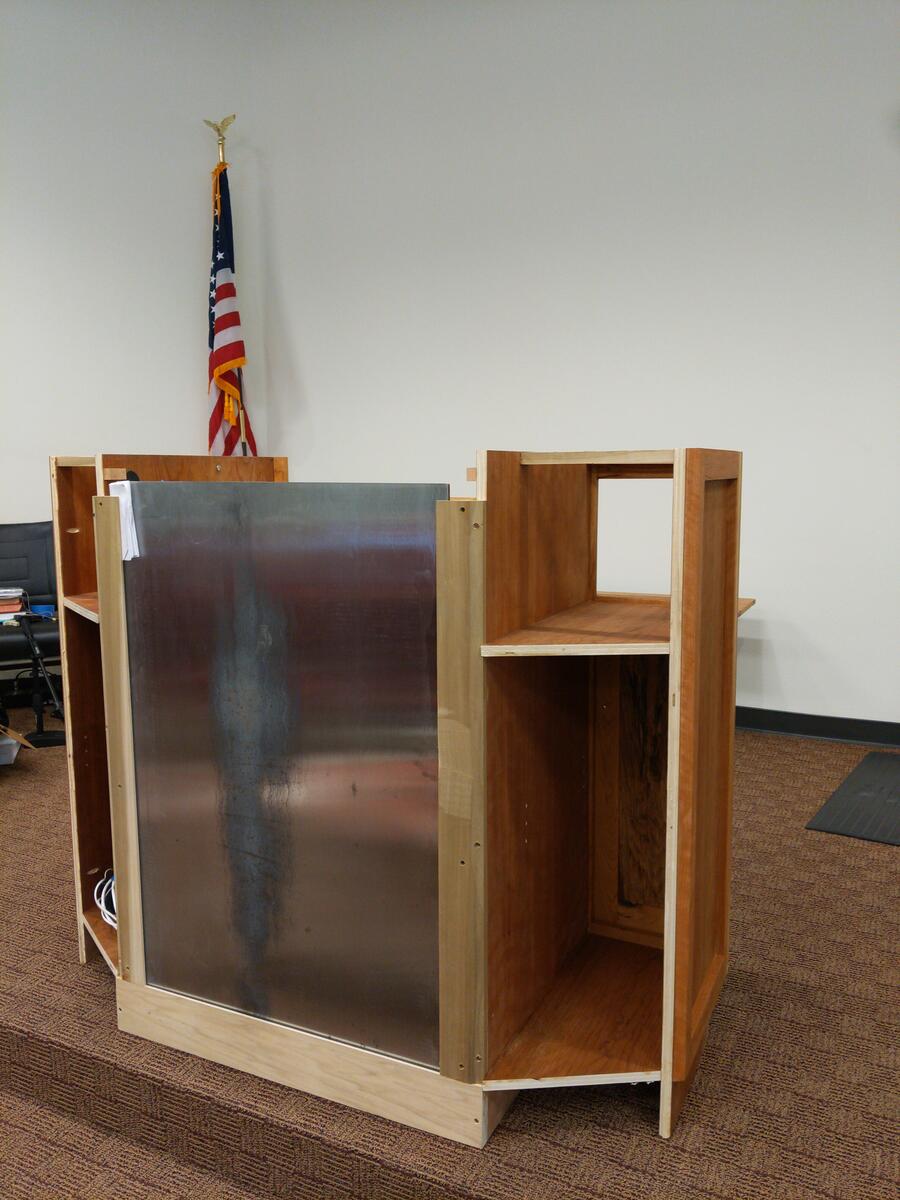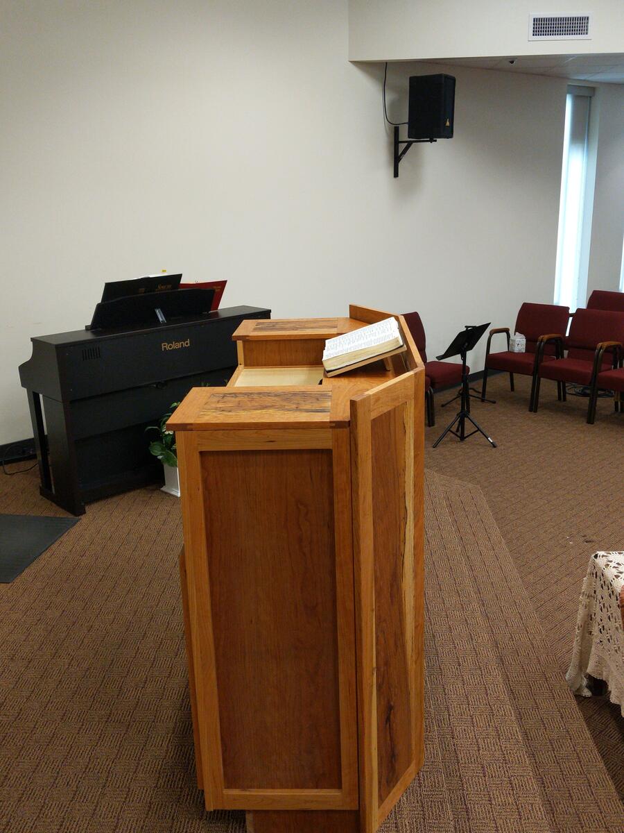 This was a fun build. It has everything built into this. The podium is made from spalted pecan and cherry. Behind the panels is a 1/2" thick balistic hardend steel. It is wired for network as well as power directly in the podium. I built in a hide-a-way area for all the wires and power which is easily accessible. I also have a false wall built in for when you are exersising your 2nd amendment rights. Also has plenty of storage. The cross on the front is proud of the panel by about 1/4 inch, and the spalted wood in the front panel was selected to give the cross to seem to be halo’d by the Light from the Son above. Very fun build.