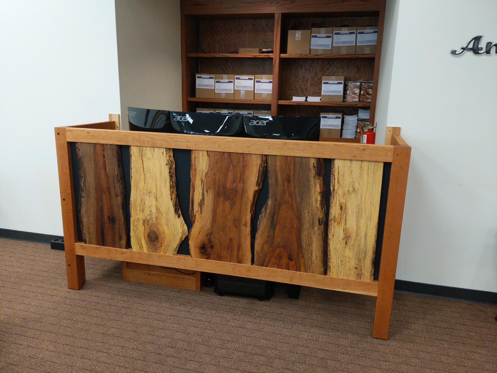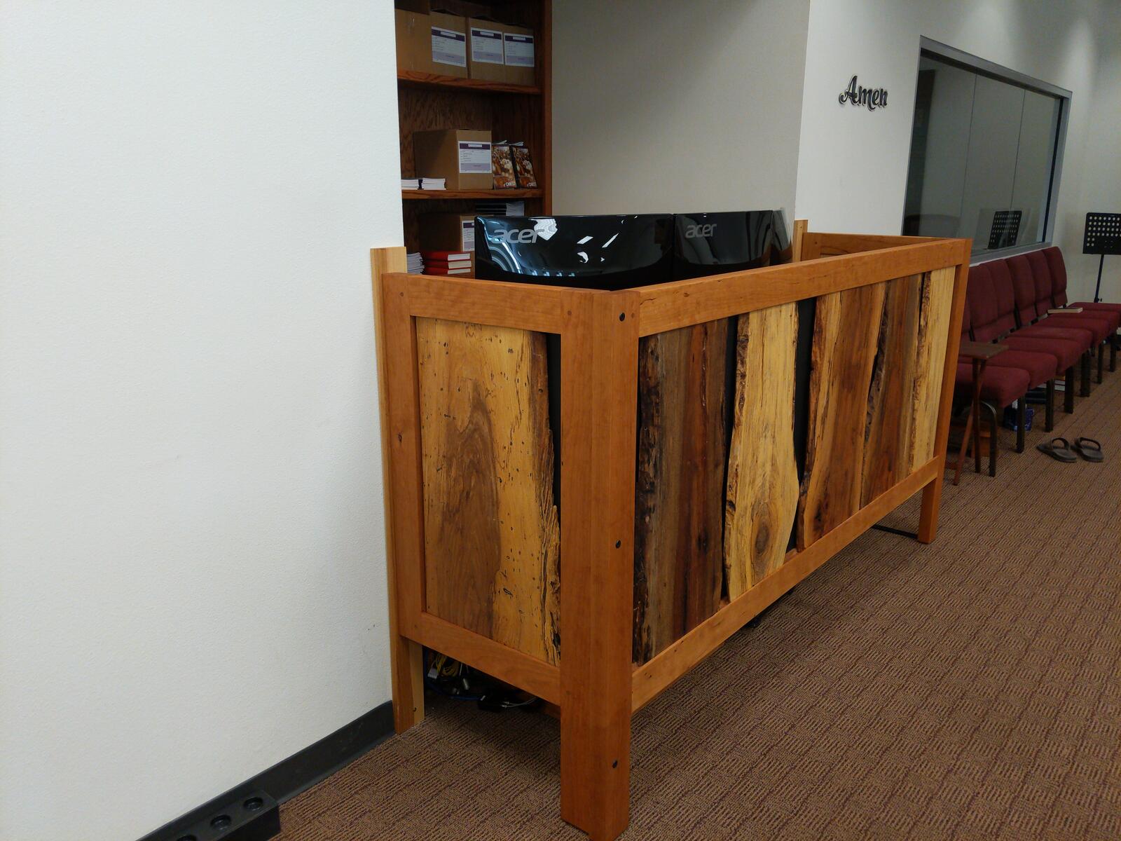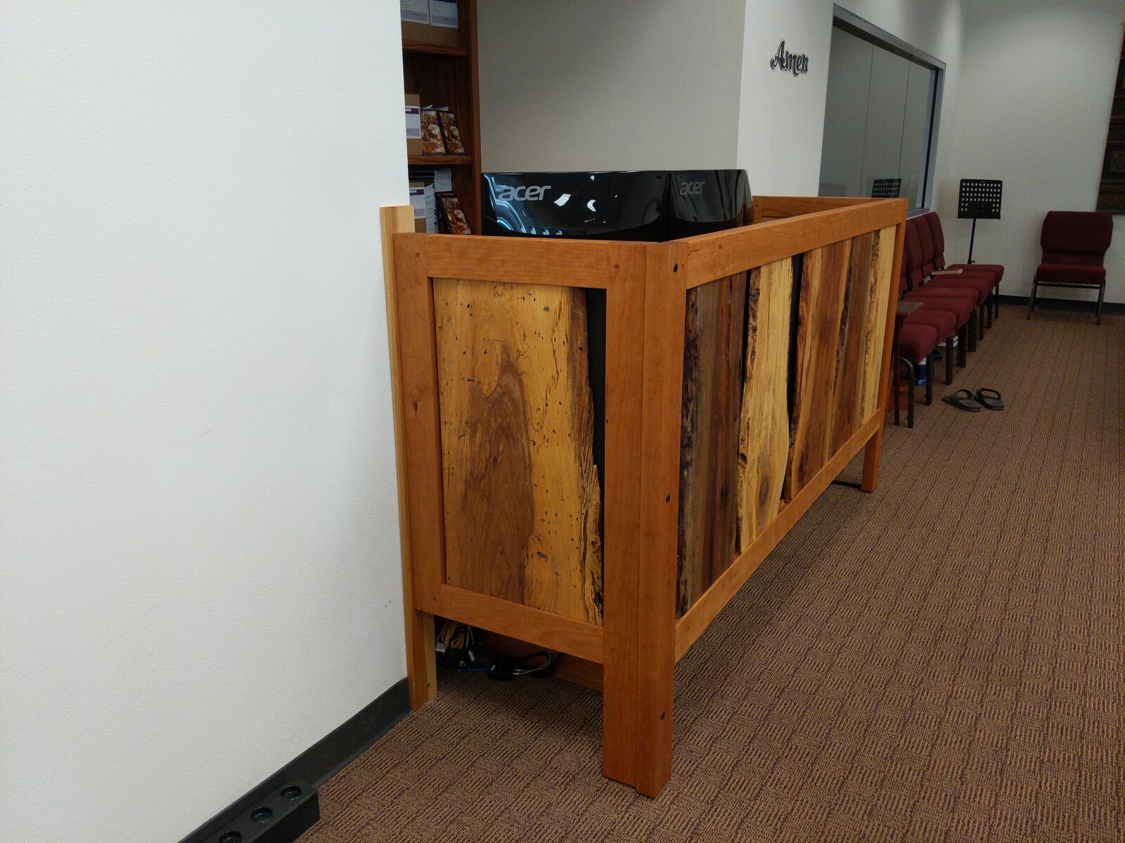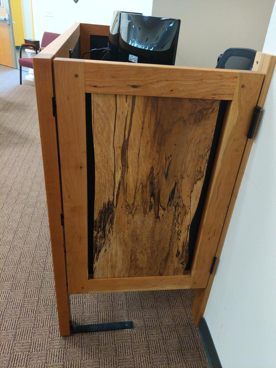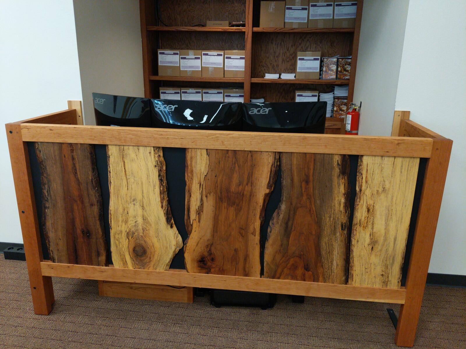 This build had some very specific requirements. The area has a very limited space, that is just a recess into the wall. The desk had to fit within the area, and also needed to have a space to hold the entire audio/video mixer and equipment. I made a large cherry base to hold all the media equipment with air circulation as well as space for wiring. The top is a pecan slab finished with hard wax finish and ceramic topcoat for smooth protection of the surface. I then made a custom surround sound to go around the area to make it a private area, with a door entry.
