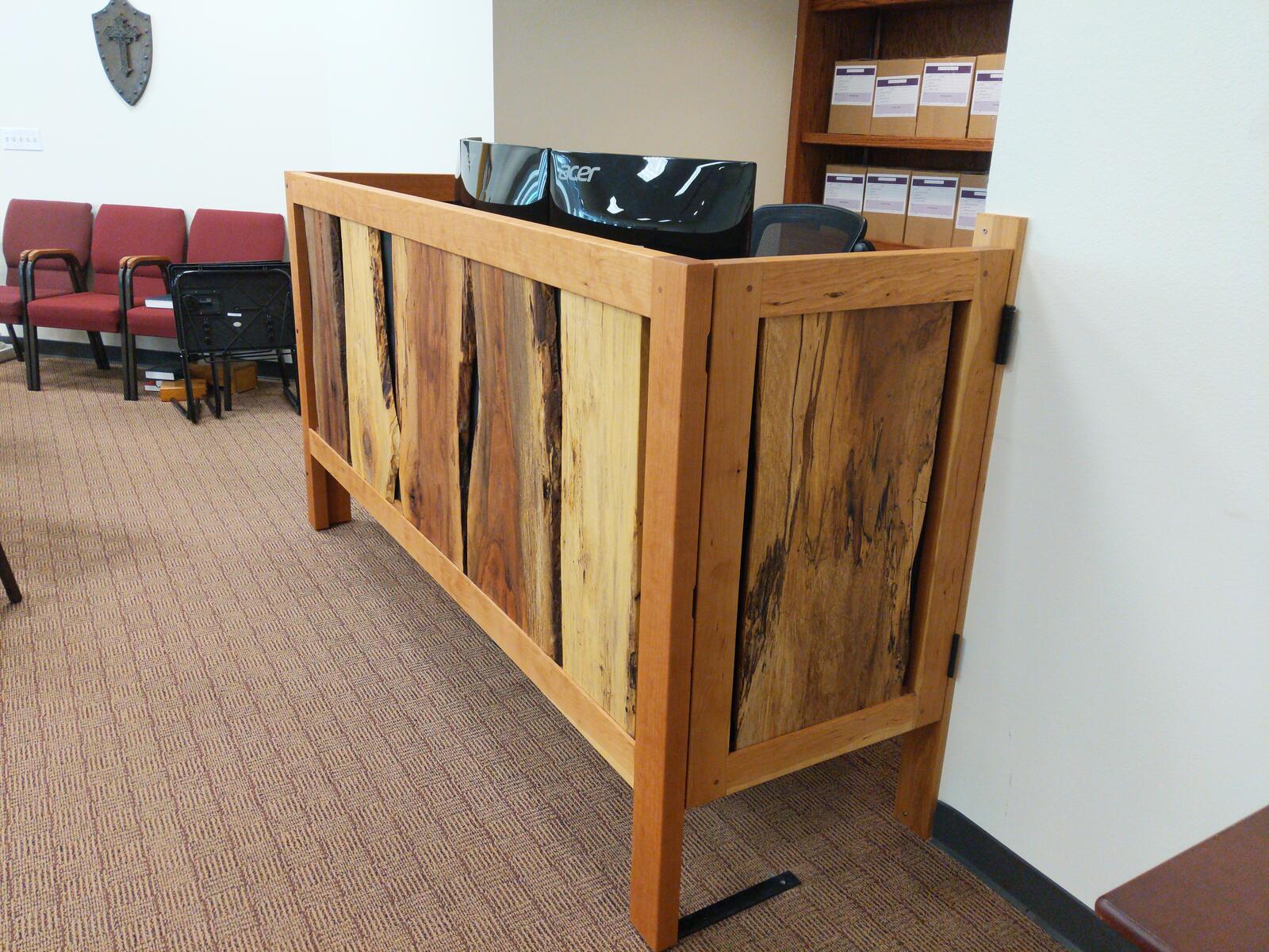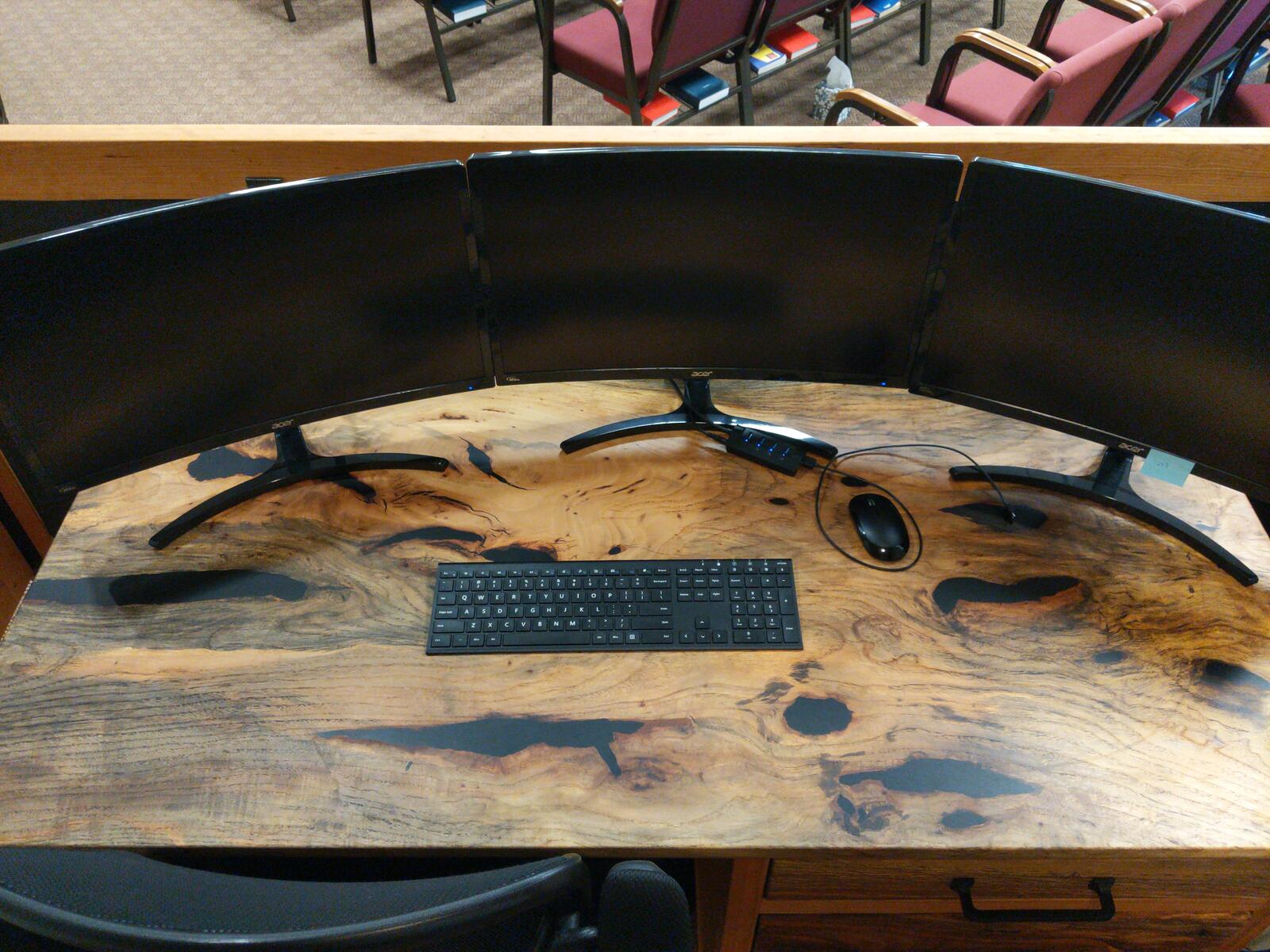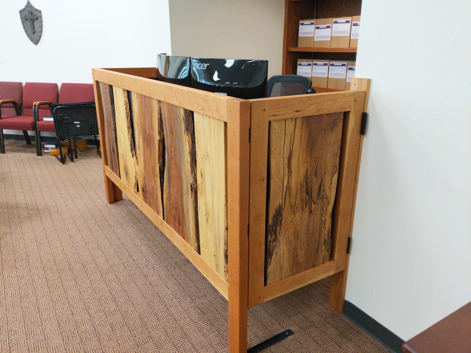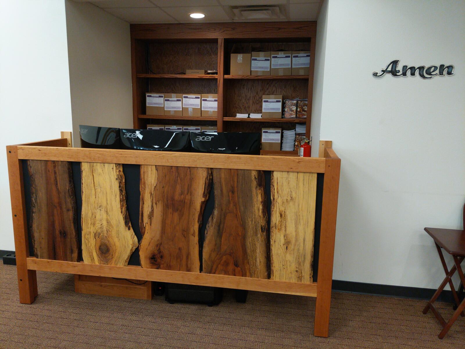 This build had some very specific requirements. The area has a very limited space, that is just a recess into the wall. The desk had to fit within the area, and also needed to have a space to hold the entire audio/video mixer and equipment. I made a large cherry base to hold all the media equipment with air circulation as well as space for wiring. The top is a pecan slab finished with hard wax finish and ceramic topcoat for smooth protection of the surface. I then made a custom surround sound to go around the area to make it a private area, with a door entry.
