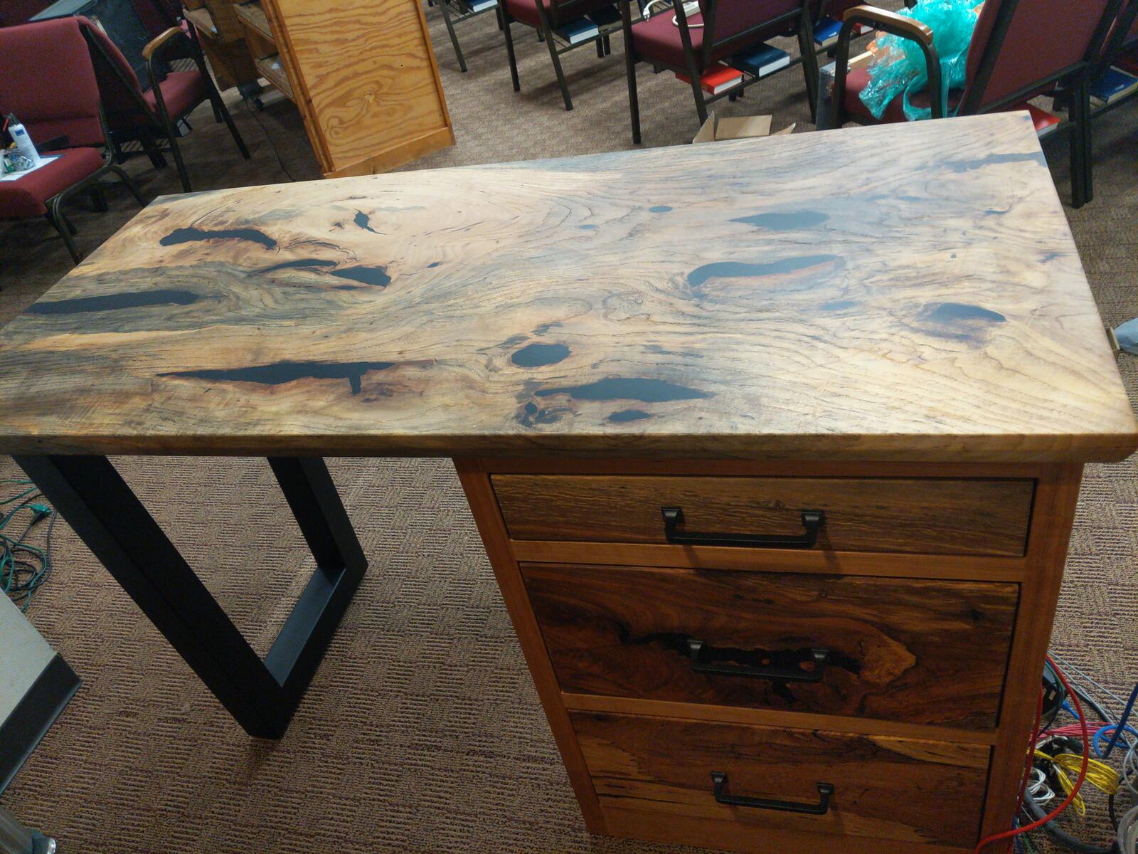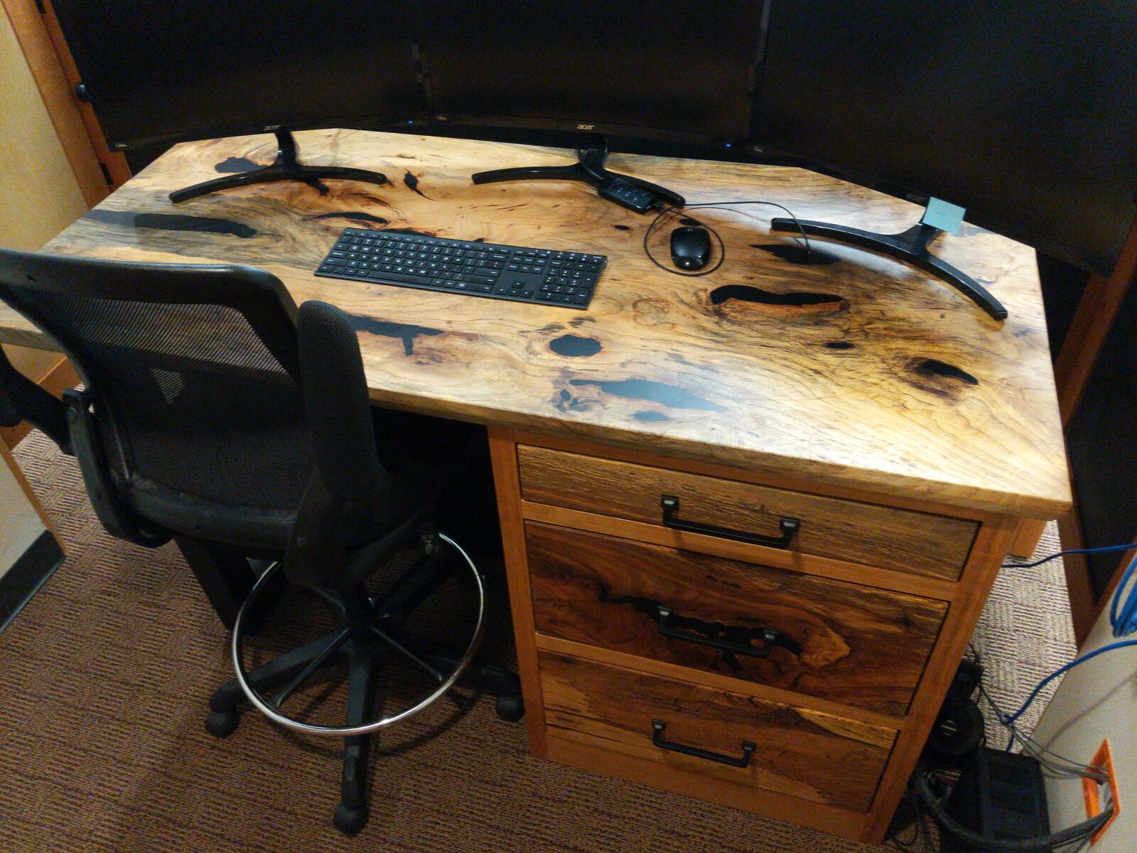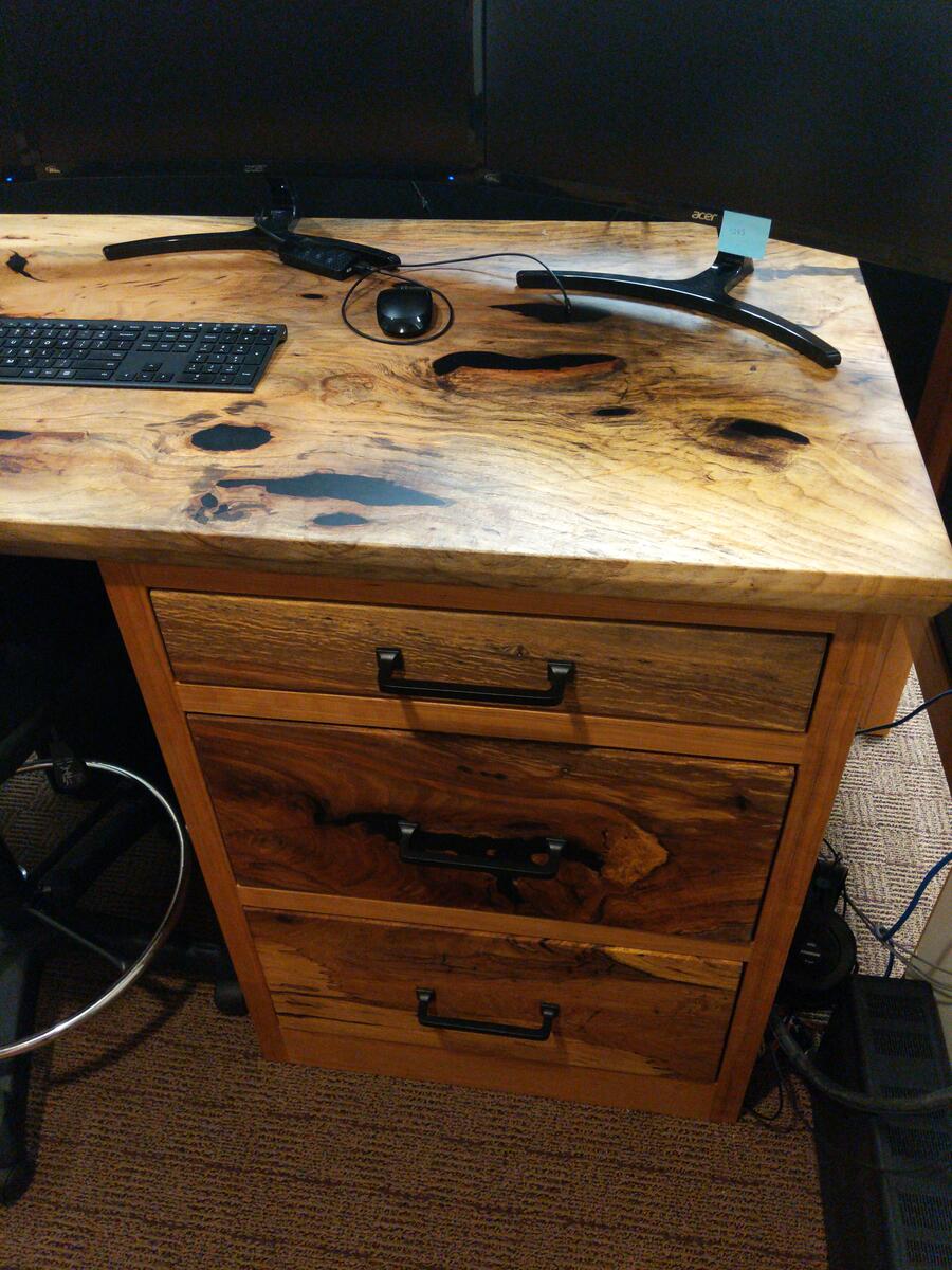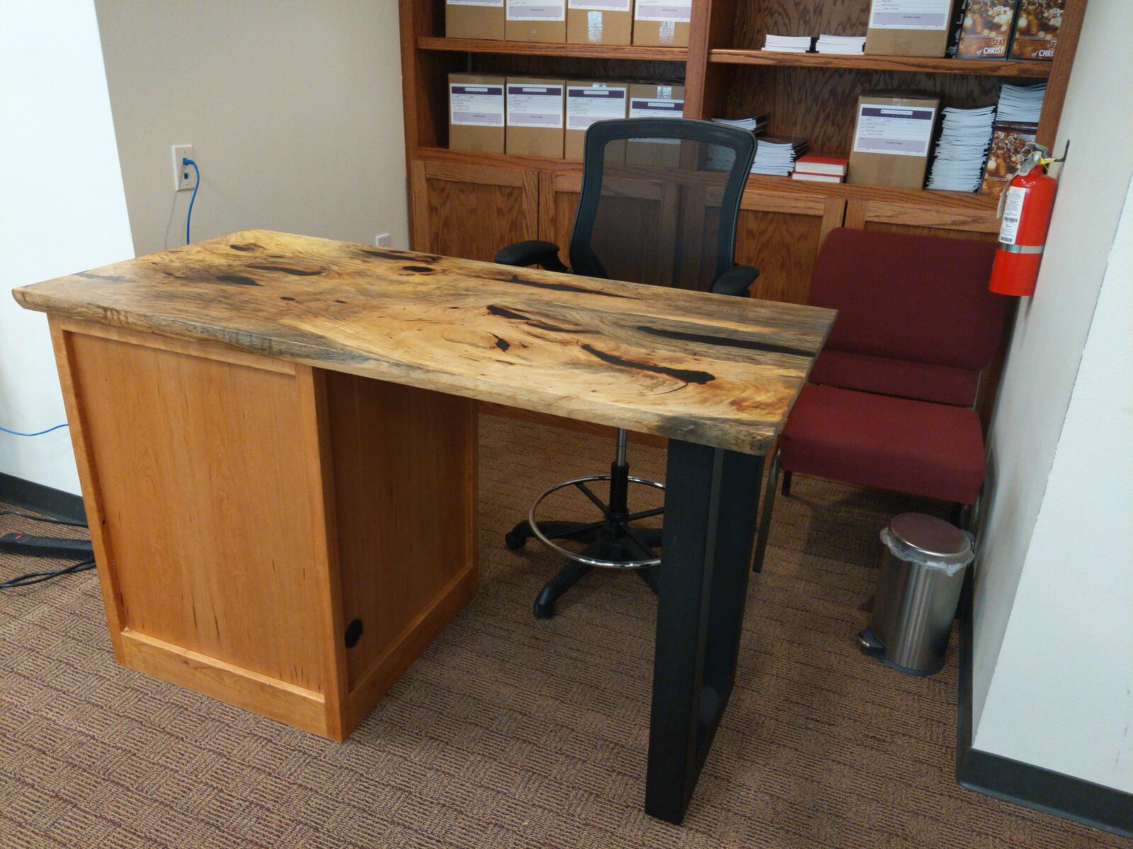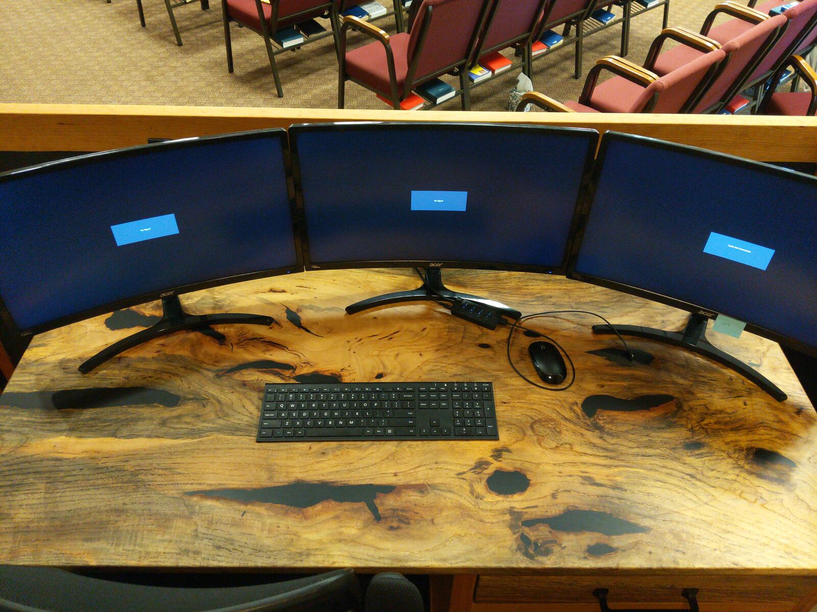 This build had some very specific requirements. The area has a very limited space, that is just a recess into the wall. The desk had to fit within the area, and also needed to have a space to hold the entire audio/video mixer and equipment. I made a large cherry base to hold all the media equipment with air circulation as well as space for wiring. The top is a pecan slab finished with hard wax finish and ceramic topcoat for smooth protection of the surface. I then made a custom surround sound to go around the area to make it a private area, with a door entry.