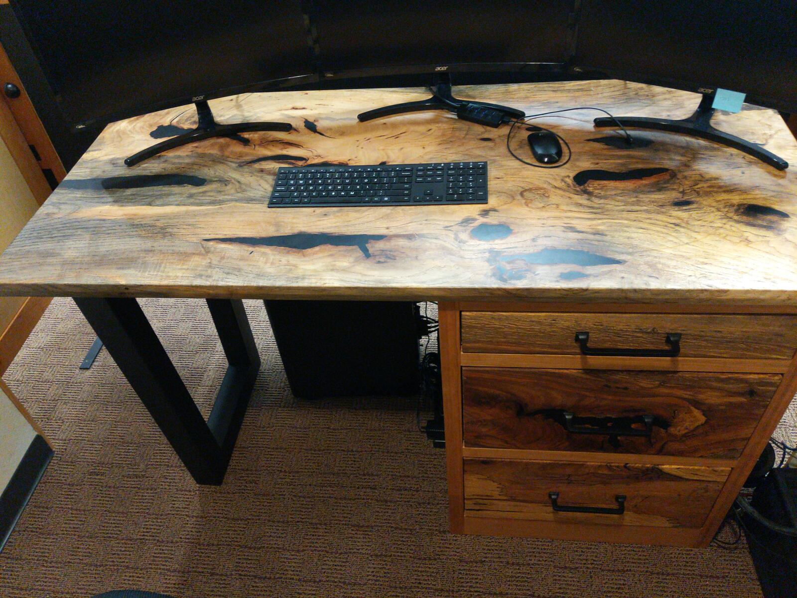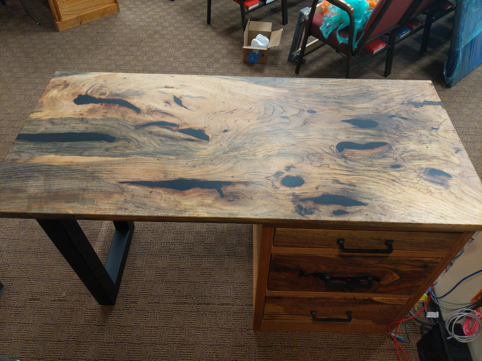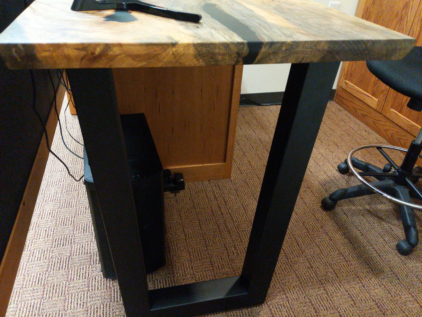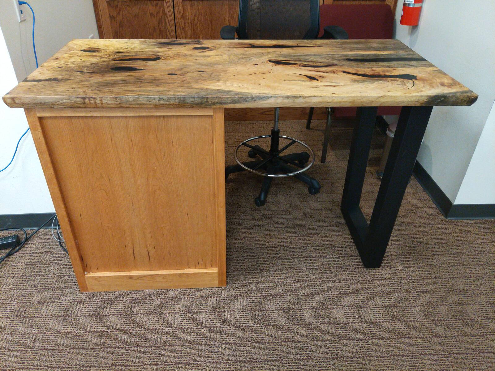 This build had some very specific requirements. The area has a very limited space, that is just a recess into the wall. The desk had to fit within the area, and also needed to have a space to hold the entire audio/video mixer and equipment. I made a large cherry base to hold all the media equipment with air circulation as well as space for wiring. The top is a pecan slab finished with hard wax finish and ceramic topcoat for smooth protection of the surface. I then made a custom surround sound to go around the area to make it a private area, with a door entry.