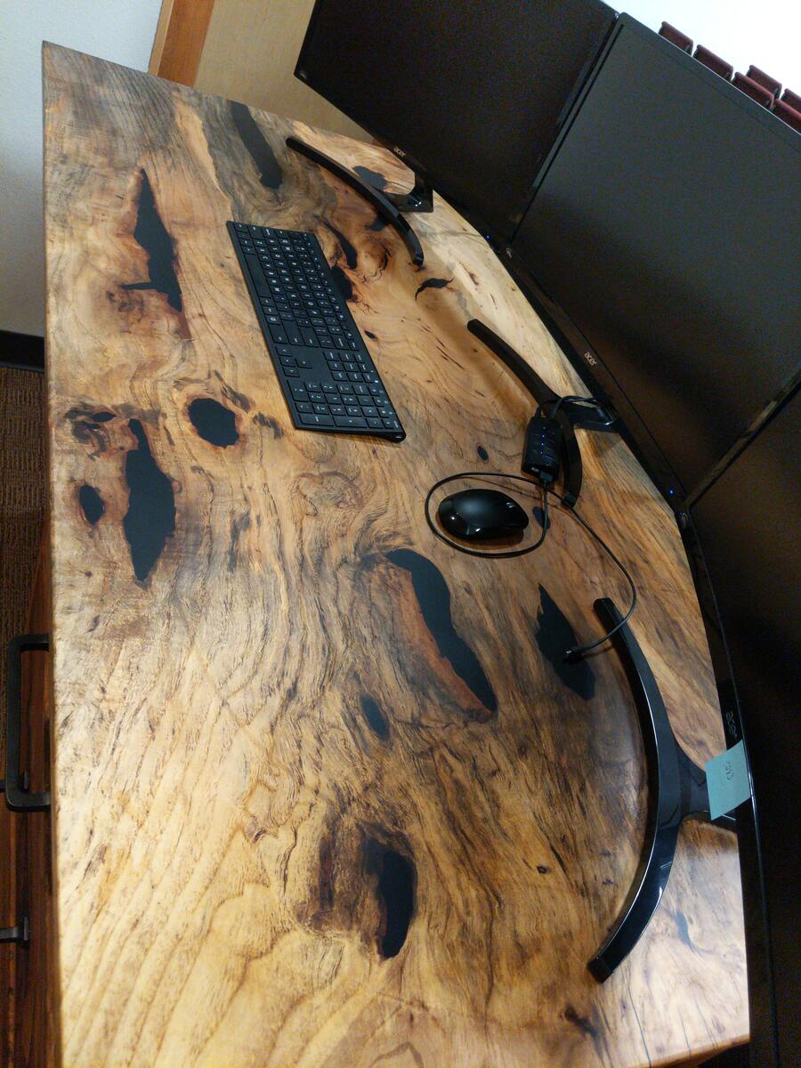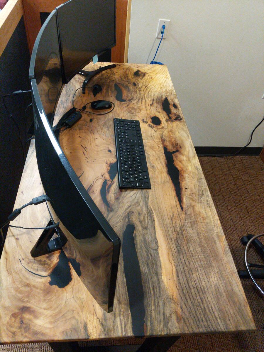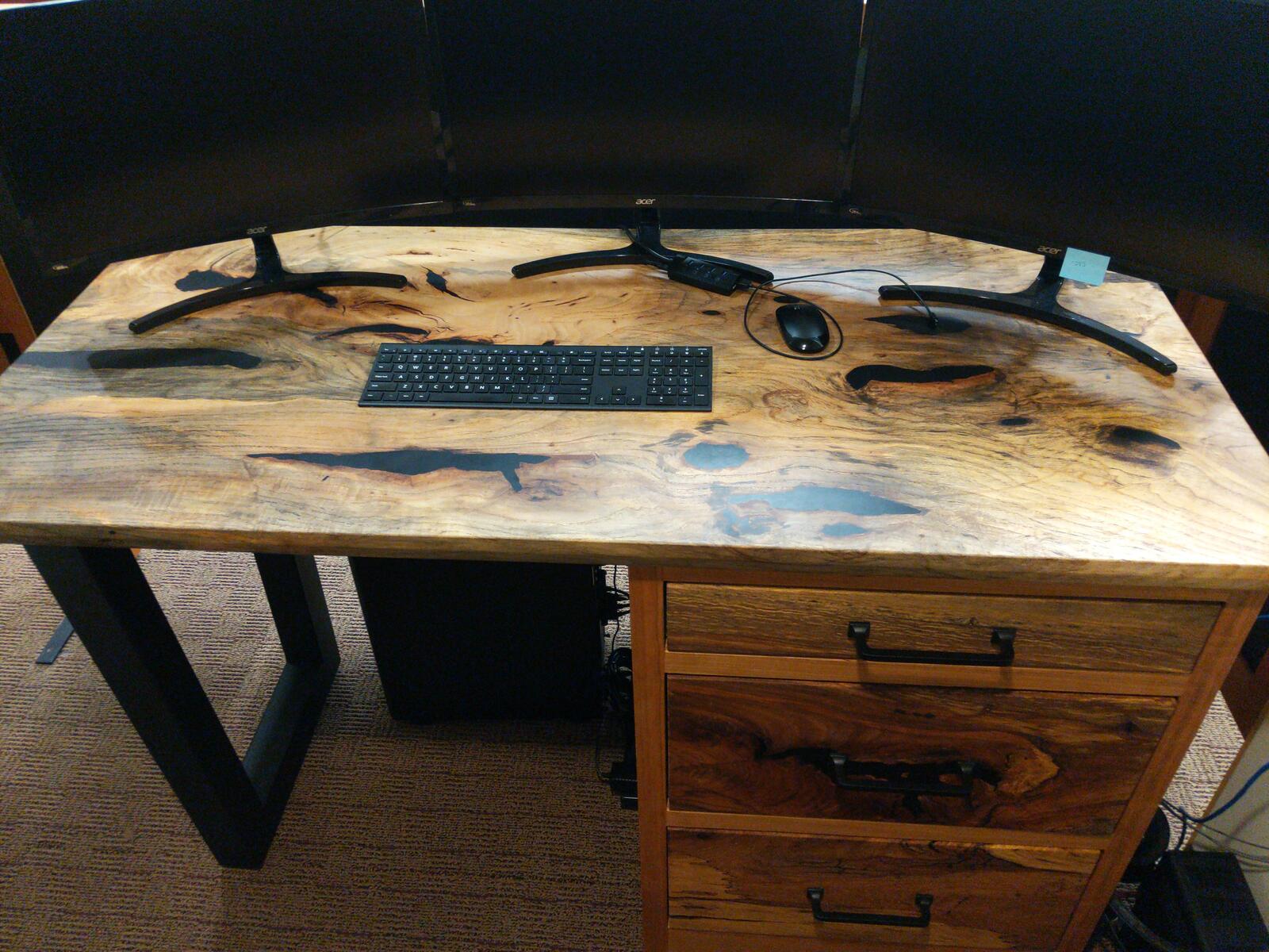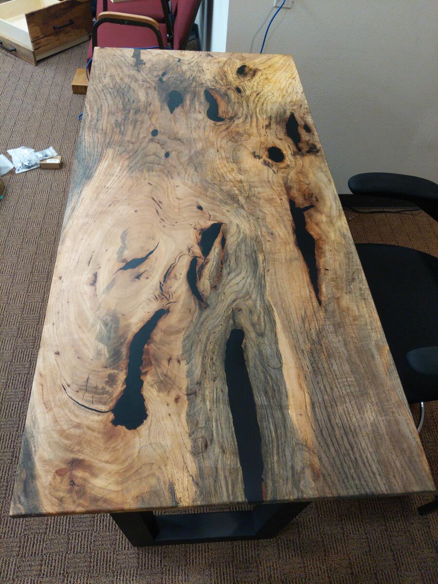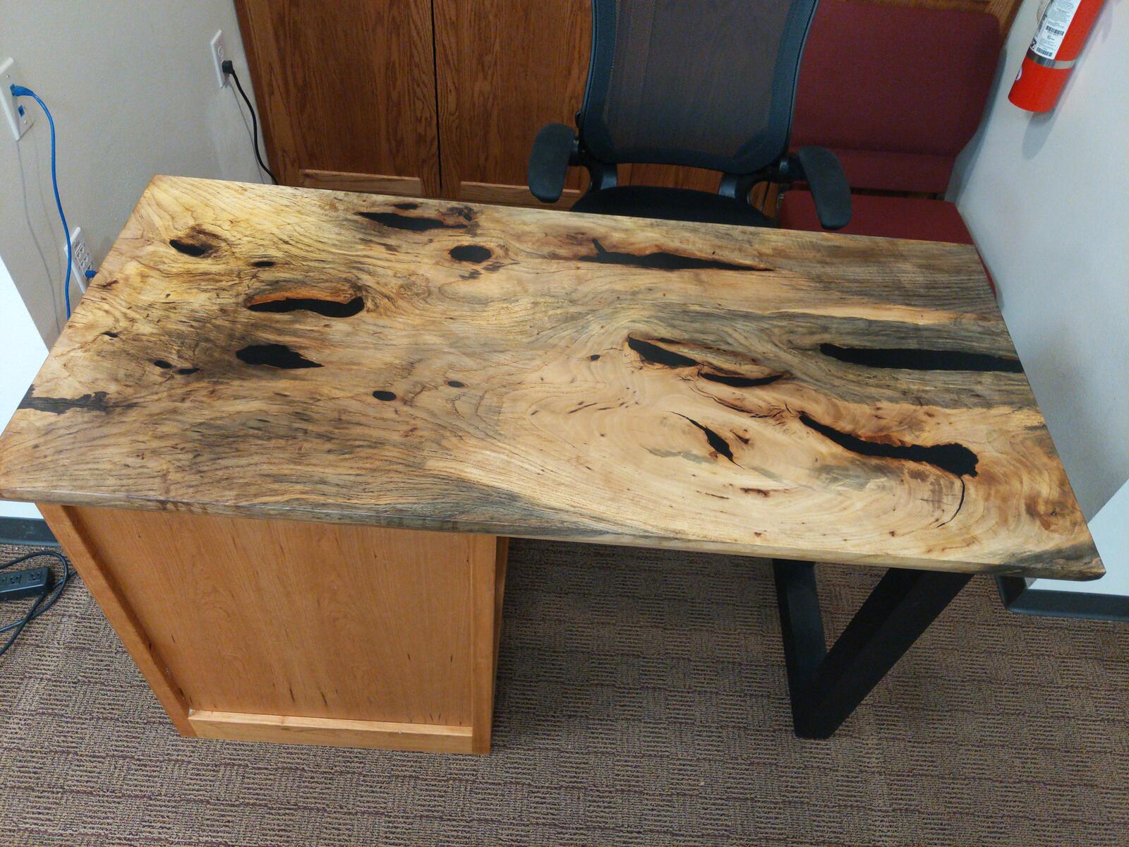 This build had some very specific requirements. The area has a very limited space, that is just a recess into the wall. The desk had to fit within the area, and also needed to have a space to hold the entire audio/video mixer and equipment. I made a large cherry base to hold all the media equipment with air circulation as well as space for wiring. The top is a pecan slab finished with hard wax finish and ceramic topcoat for smooth protection of the surface. I then made a custom surround sound to go around the area to make it a private area, with a door entry.