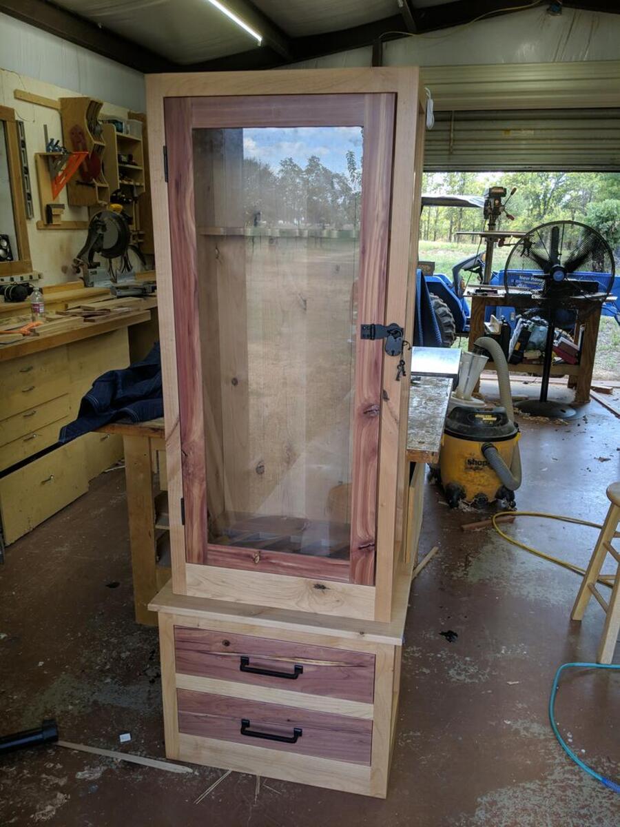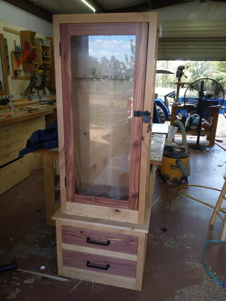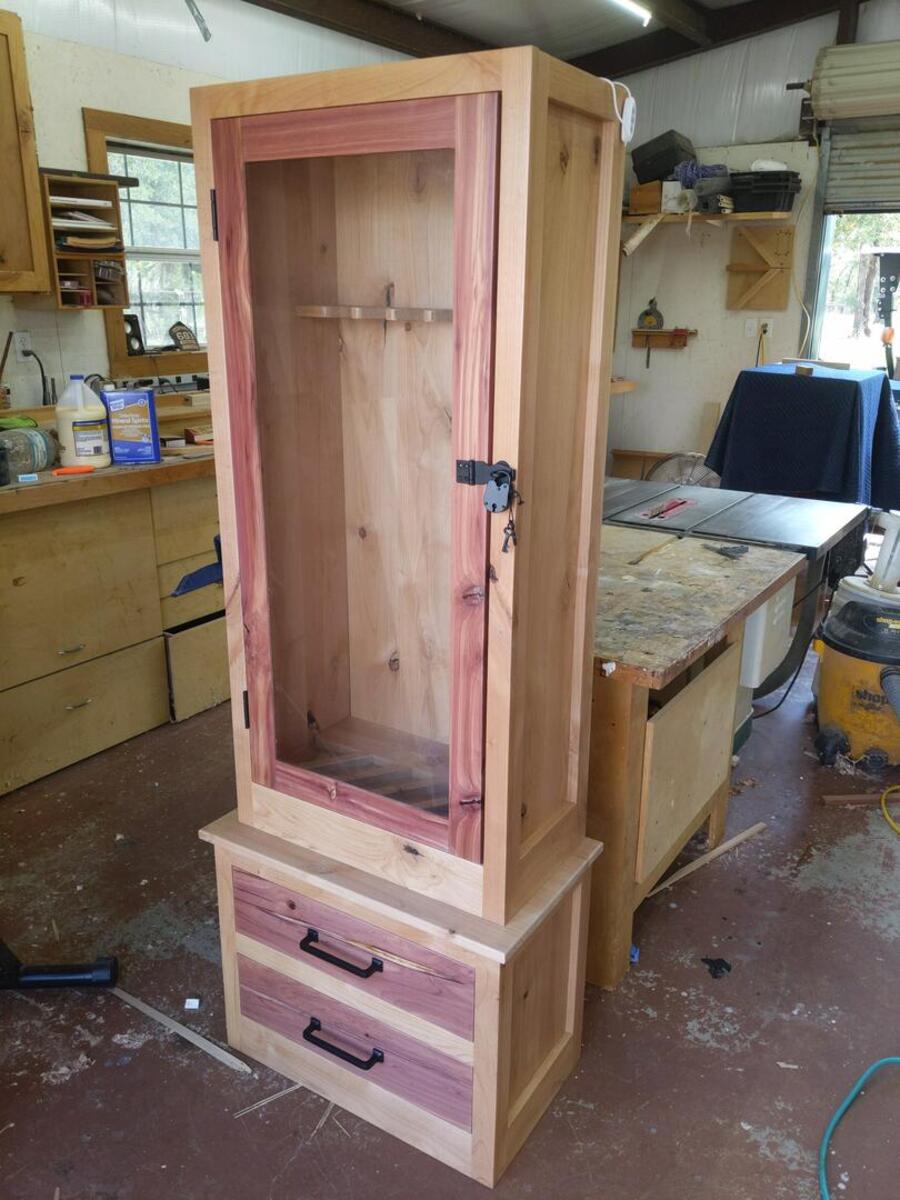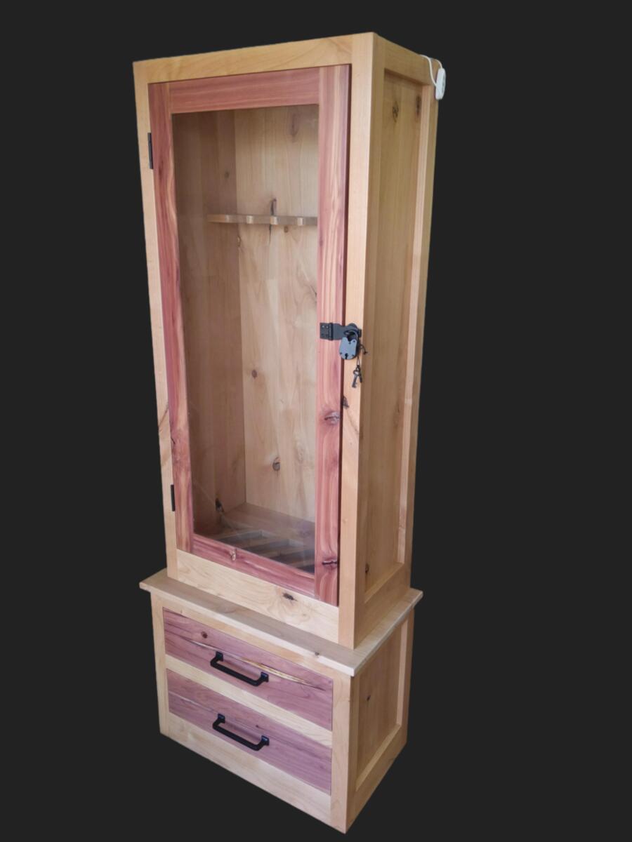 Home/Projects/Cedar and Alder Gun Cabinet/Cedar and Alder Gun CabinetSeptember 29 2023Cabinets Cedar AlderGun cabinet made from cedar and alder with lower storage and interior lighting. Also has old fashion locks and rod iron hardware.