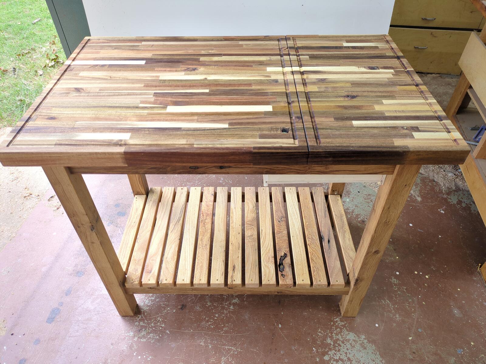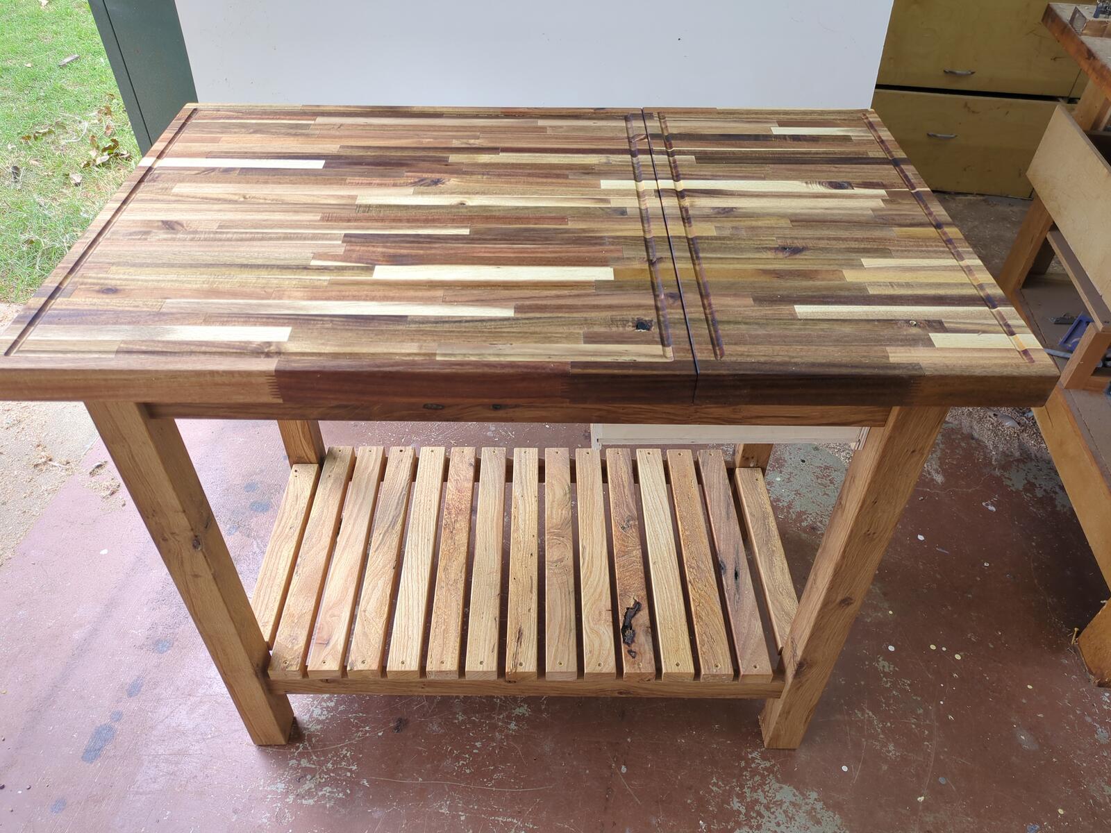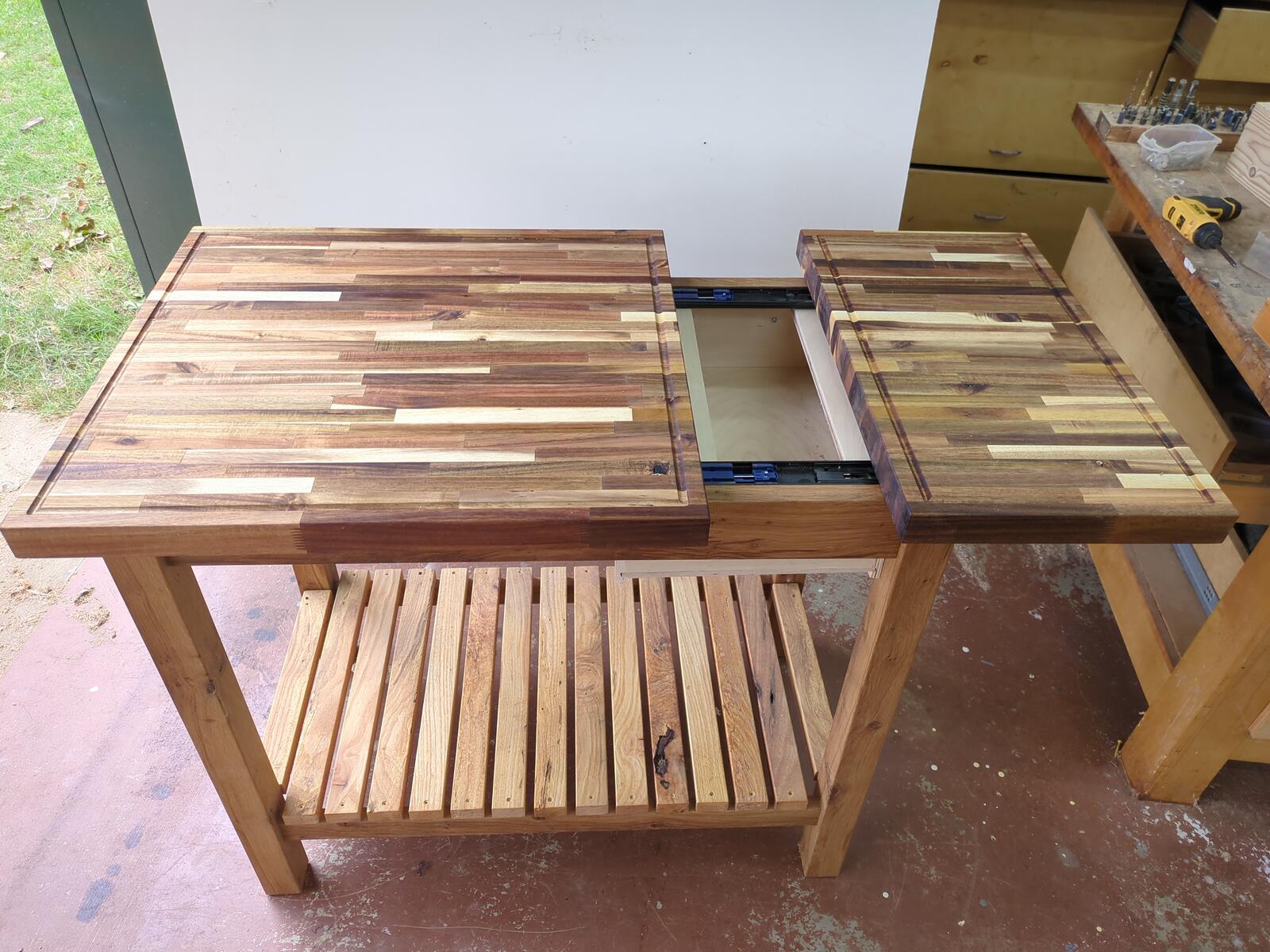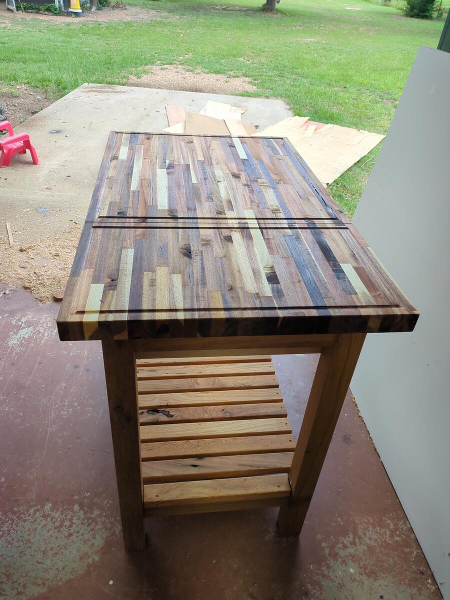 A customer came to me and he had a couple large pieces of butcher block that he wanted to make something out of. The problem was, he had cut a large section off, and it really looked odd due to the size (woodworking “golden rule” on rectangles). After working with it, I came up with this concept and he liked it. I made a large island top, putting both pieces together, which open up on slides to access a hidden box for storage. When closed, you have a very large top with 2 separate cutting boards with there own juice groove. The entire base was constructed from reclaimed oak wood which is great for outdoor furniture. The cutting board is sealed with pure tung oil, giving it a strong seal that is 100% natural.