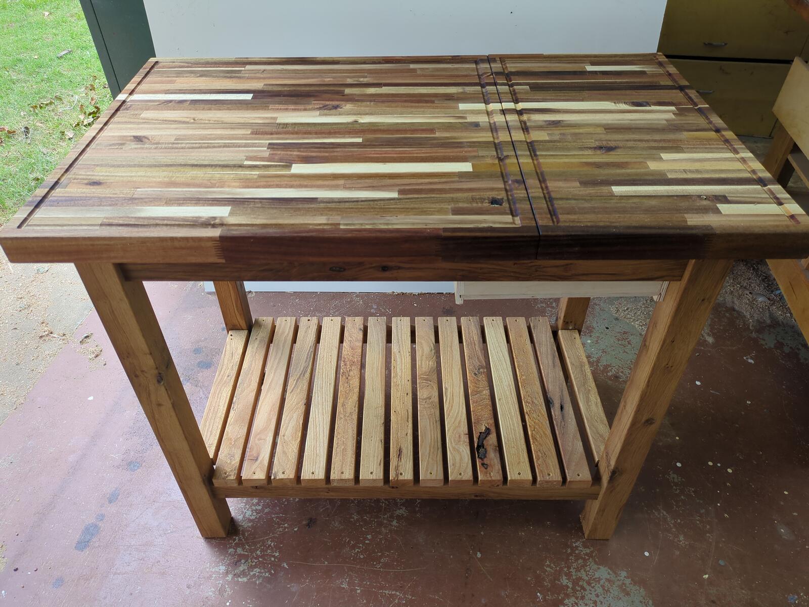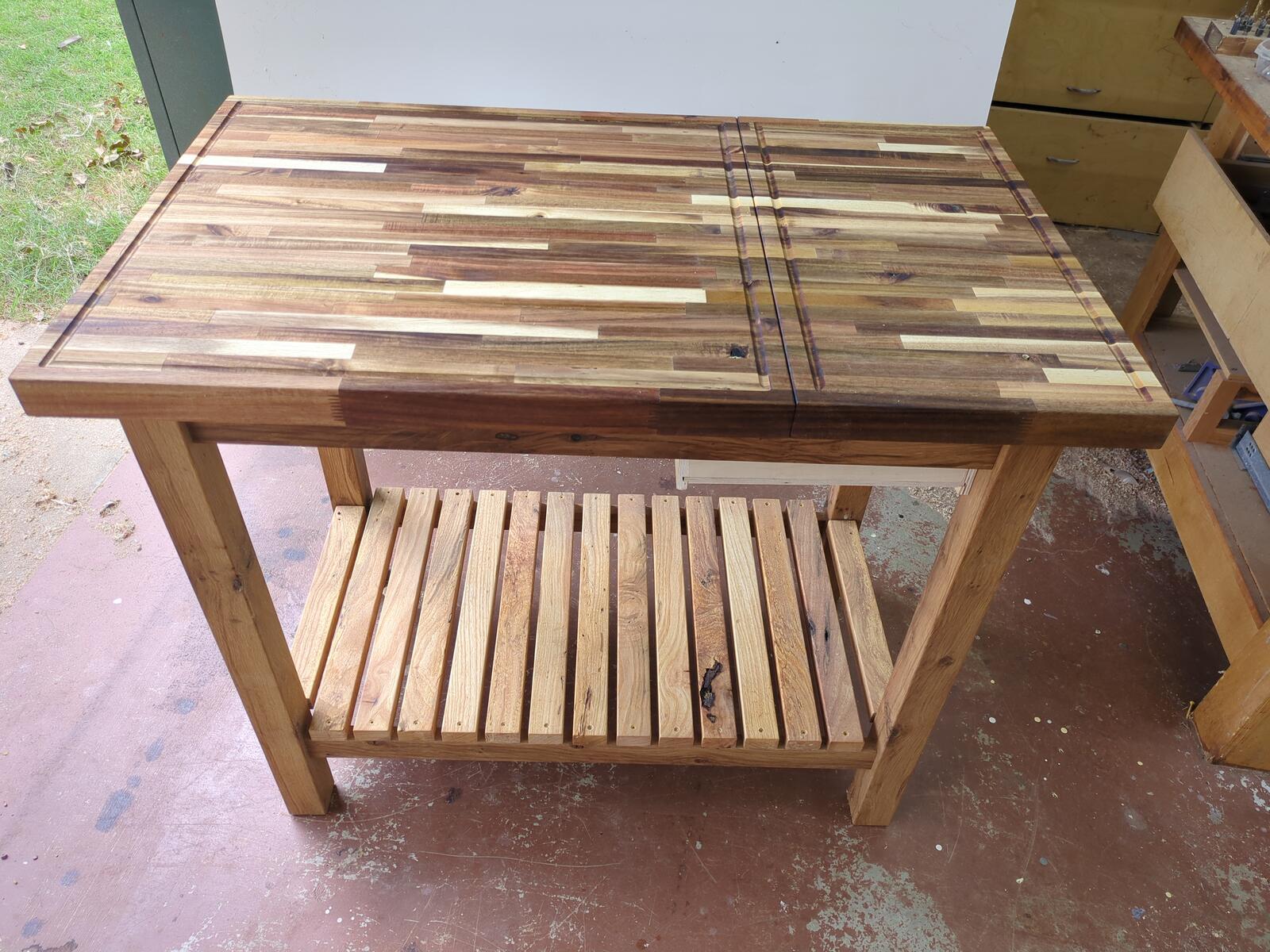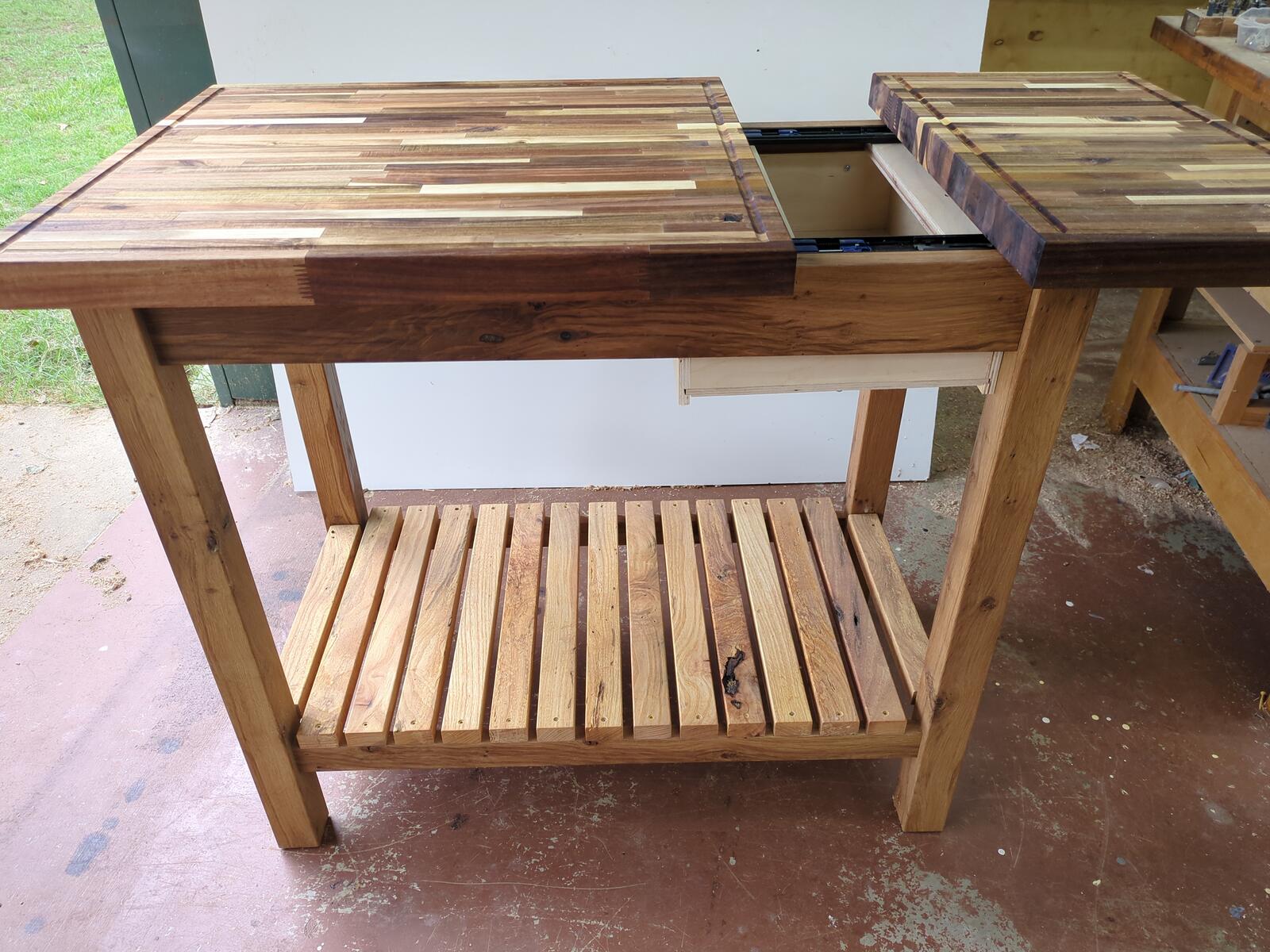 A customer came to me and he had a couple large pieces of butcher block that he wanted to make something out of. The problem was, he had cut a large section off, and it really looked odd due to the size (woodworking “golden rule” on rectangles). After working with it, I came up with this concept and he liked it. I made a large island top, putting both pieces together, which open up on slides to access a hidden box for storage. When closed, you have a very large top with 2 separate cutting boards with there own juice groove. The entire base was constructed from reclaimed oak wood which is great for outdoor furniture. The cutting board is sealed with pure tung oil, giving it a strong seal that is 100% natural.